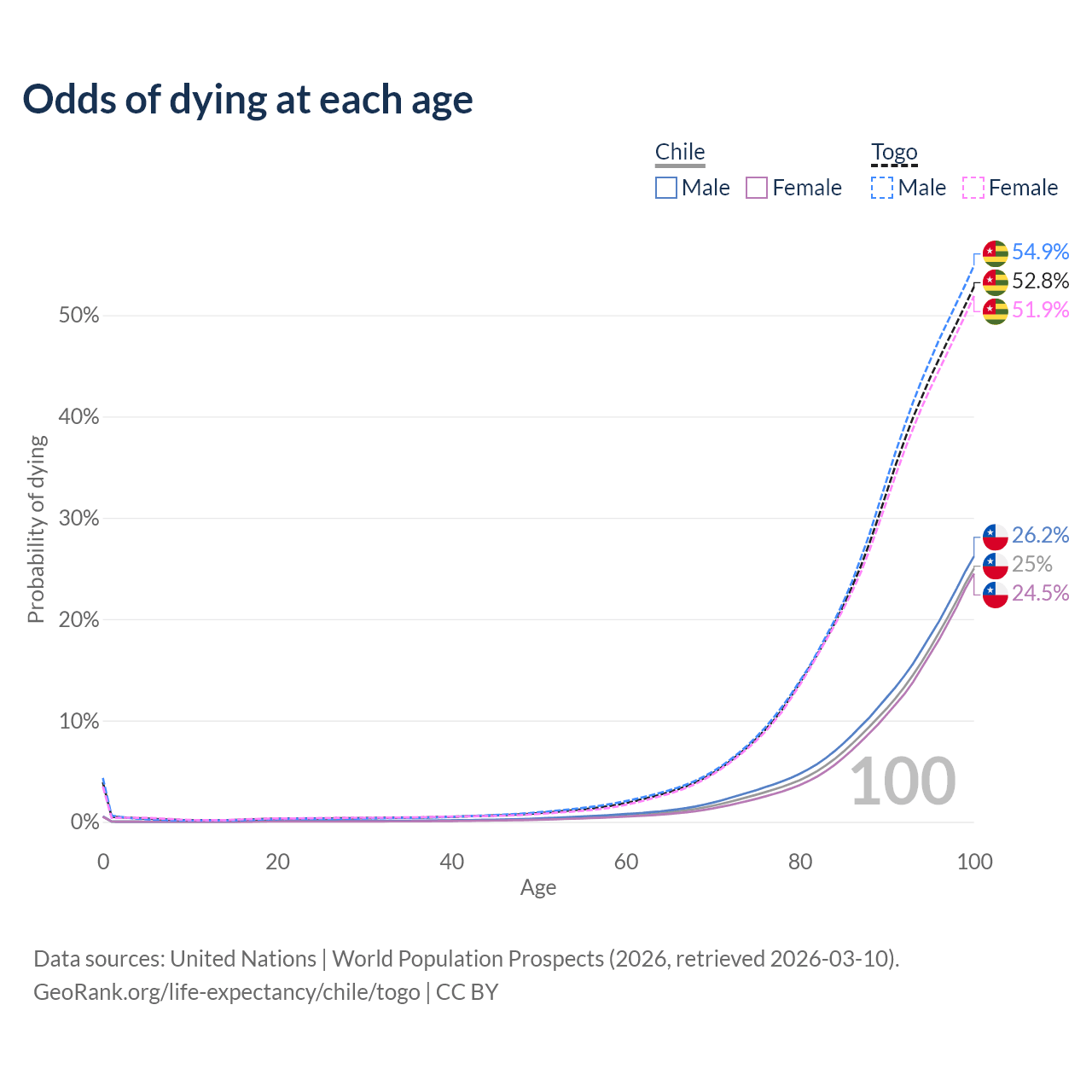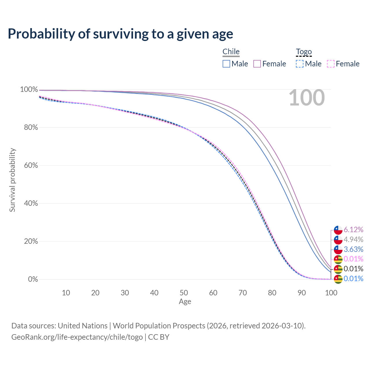 This life expectancy calculator shows the odds of living to 100, 95, 90, and below based on current age for both males and females in Chile and Togo, along with mean and median age of death. The calculations are based on the 2026 life tables (actuarial tables) from the UN World Population Prospects.
