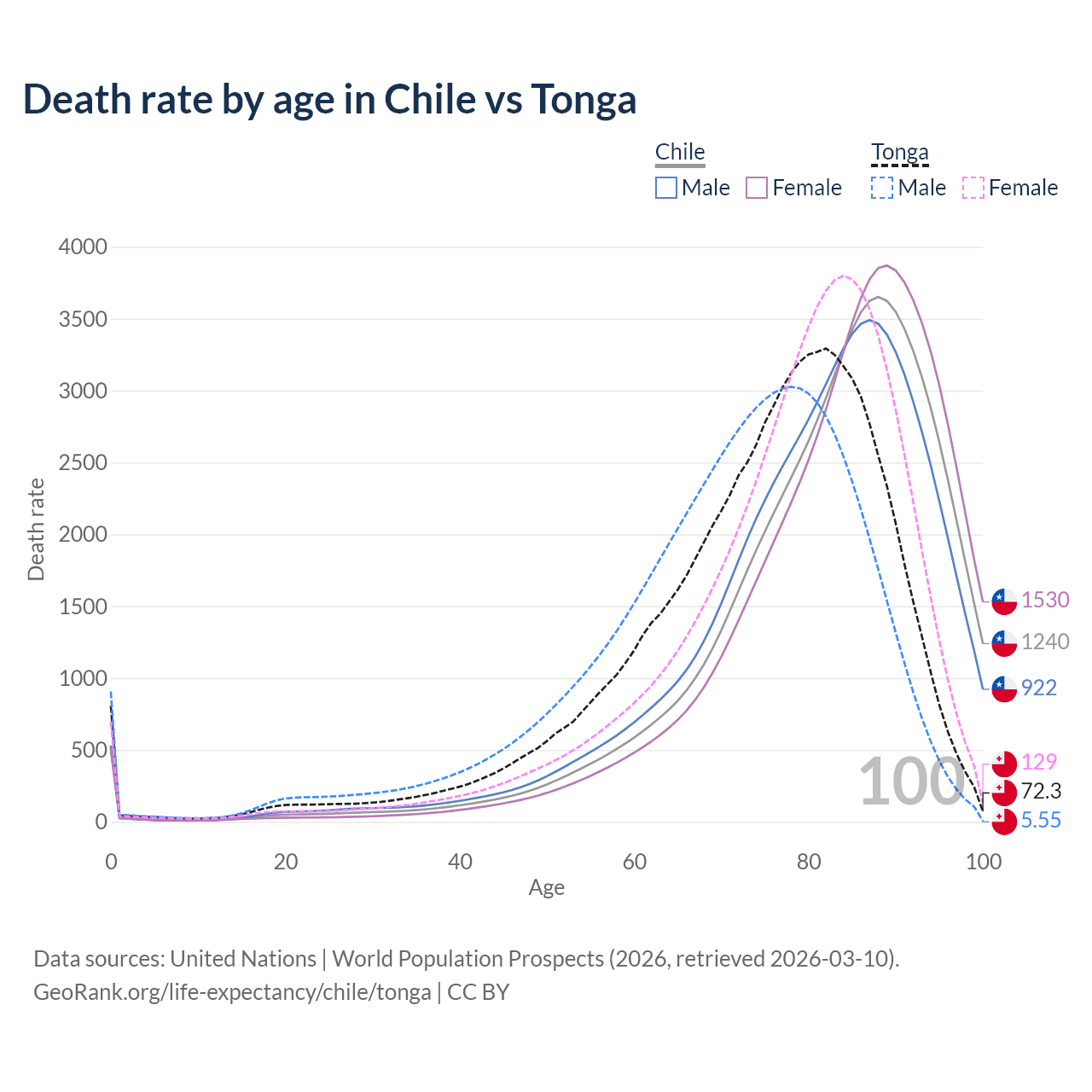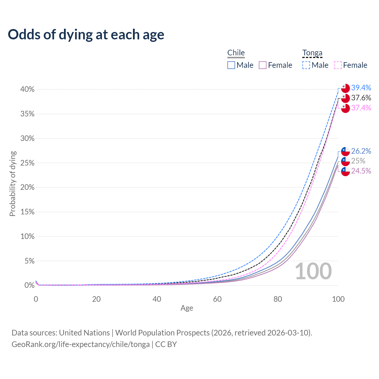 This life expectancy calculator shows the odds of living to 100, 95, 90, and below based on current age for both males and females in Chile and Tonga, along with mean and median age of death. The calculations are based on the 2026 life tables (actuarial tables) from the UN World Population Prospects.