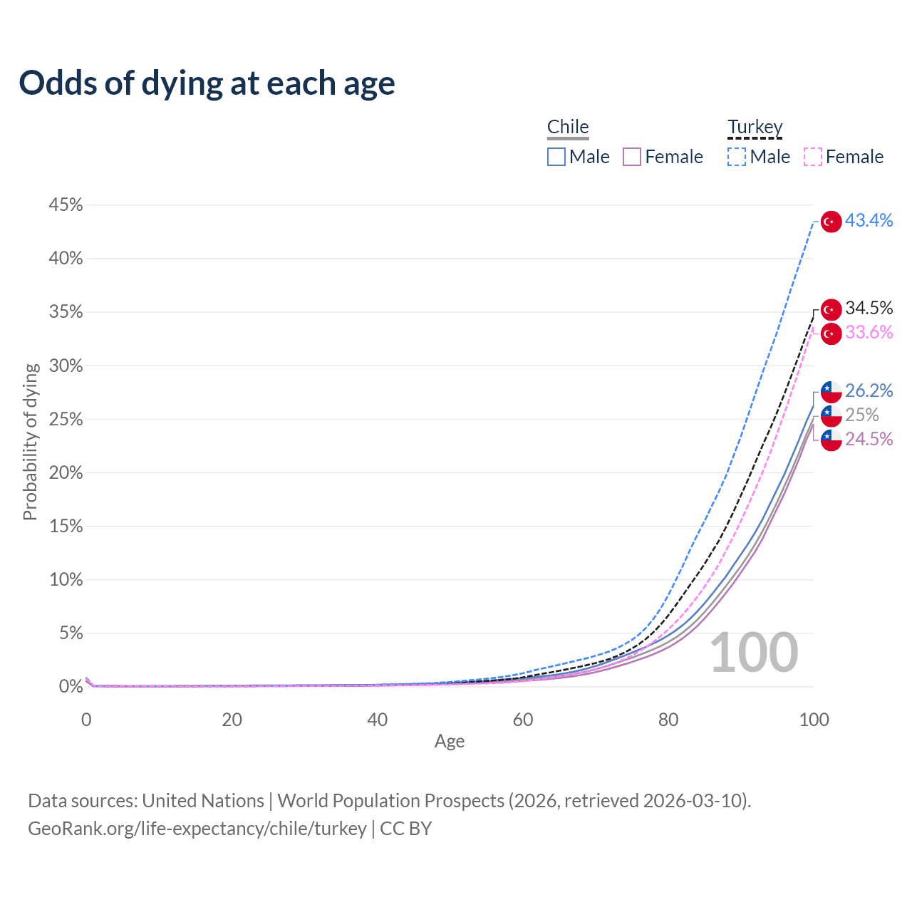 This life expectancy calculator shows the odds of living to 100, 95, 90, and below based on current age for both males and females in Chile and Turkey, along with mean and median age of death. The calculations are based on the 2026 life tables (actuarial tables) from the UN World Population Prospects.