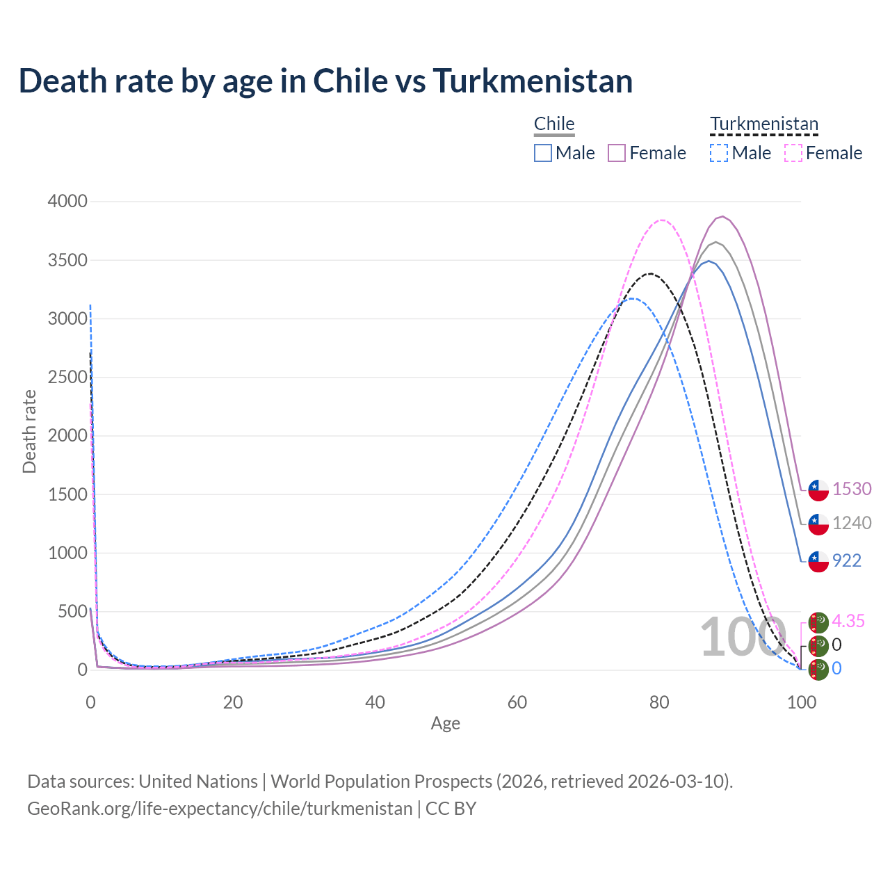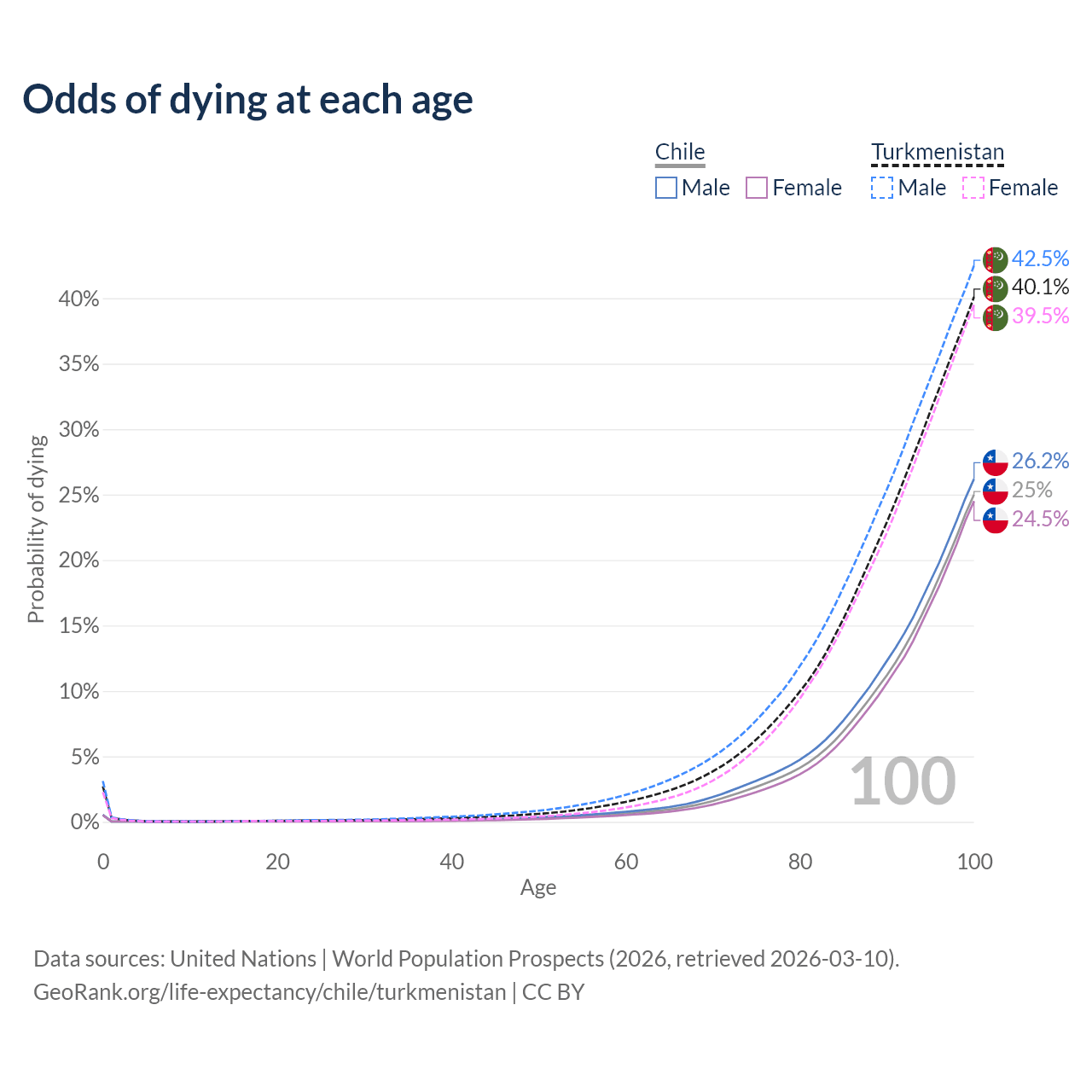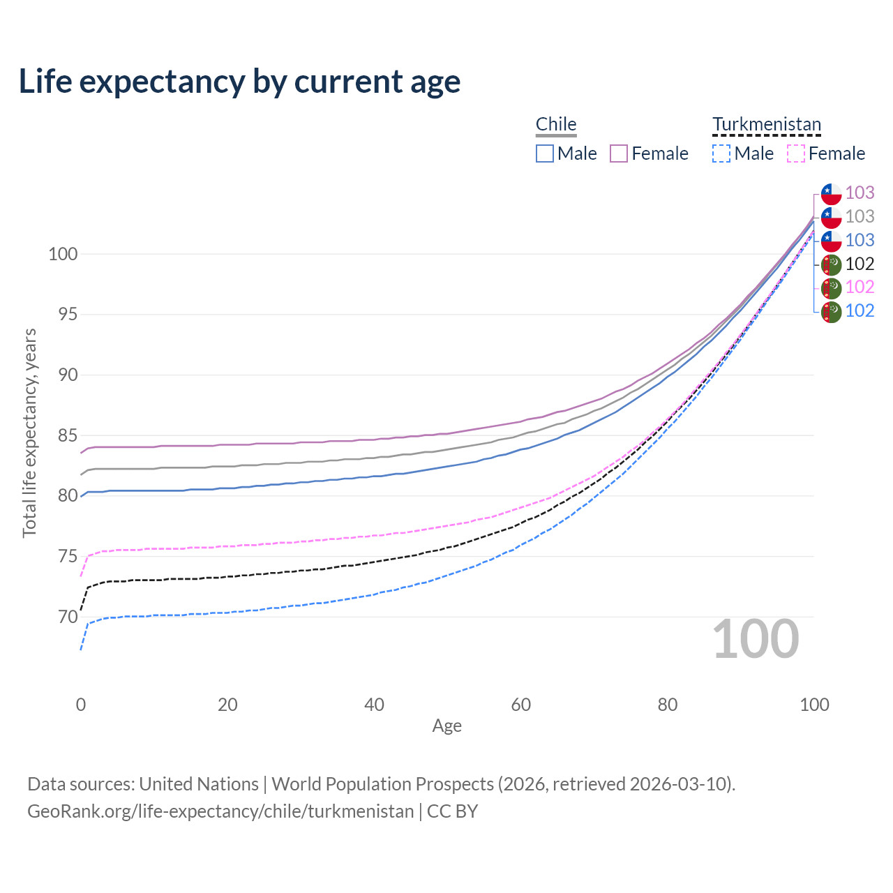 This life expectancy calculator shows the odds of living to 100, 95, 90, and below based on current age for both males and females in Chile and Turkmenistan, along with mean and median age of death. The calculations are based on the 2026 life tables (actuarial tables) from the UN World Population Prospects.