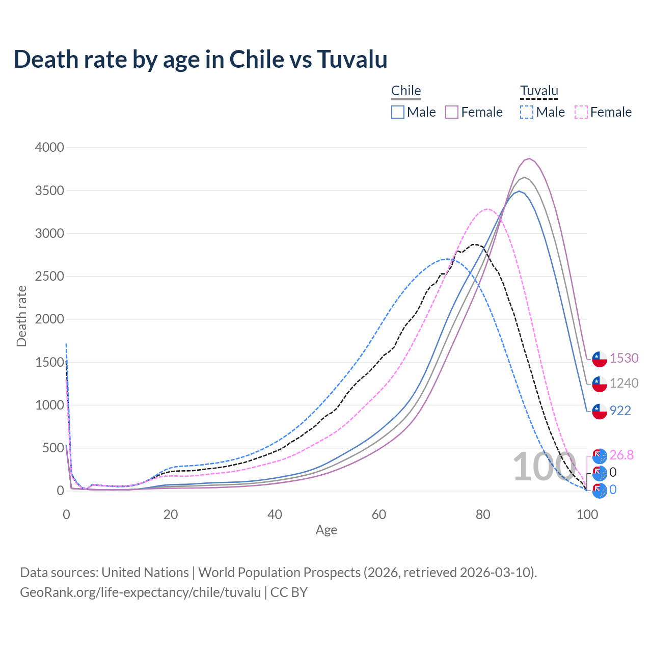 In Chile, the most common age of death is 88, compared to 78 in Tuvalu. The median age of death is 84.8 in Chile and 71.9 in Tuvalu, meaning only half of each cohort is expected to live past that age.