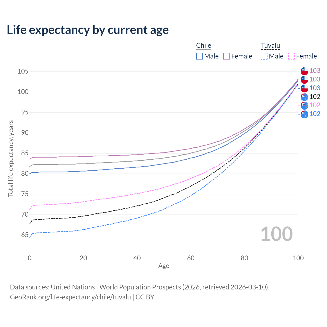 The average life expectancy at birth is 81.7 years in Chile vs 67.6 in Tuvalu. Chile is ranked 38/197 by life expectancy, and Tuvalu is 156/197. In Chile, the life expectancy is 79.9 years for males and 83.5 years for females. In Tuvalu, it's 64.2 years for males and 71.2 years for females.