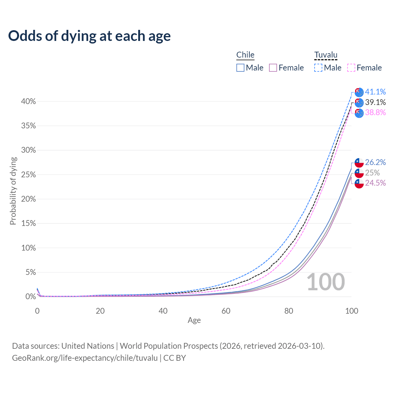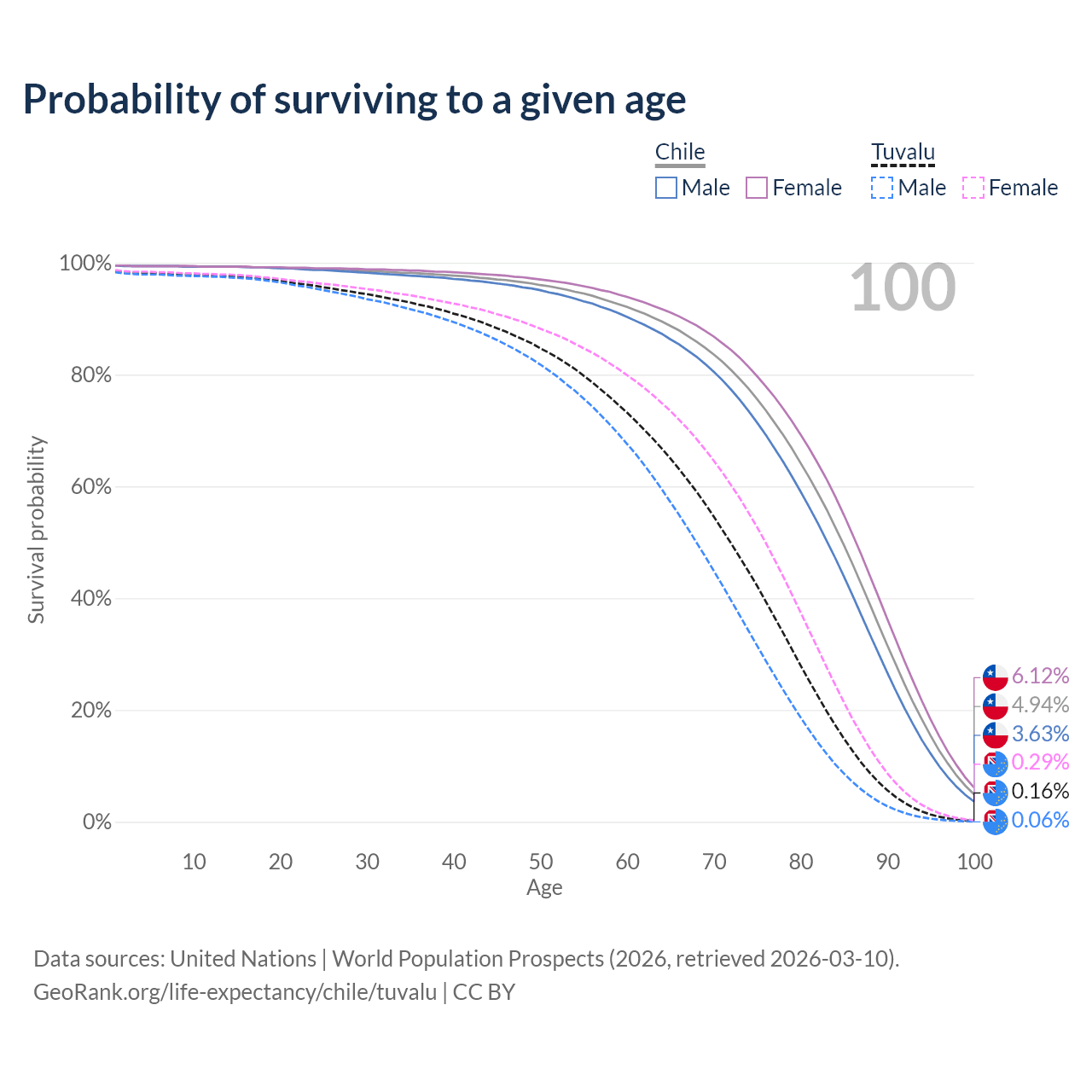This life expectancy calculator shows the odds of living to 100, 95, 90, and below based on current age for both males and females in Chile and Tuvalu, along with mean and median age of death. The calculations are based on the 2026 life tables (actuarial tables) from the UN World Population Prospects.
