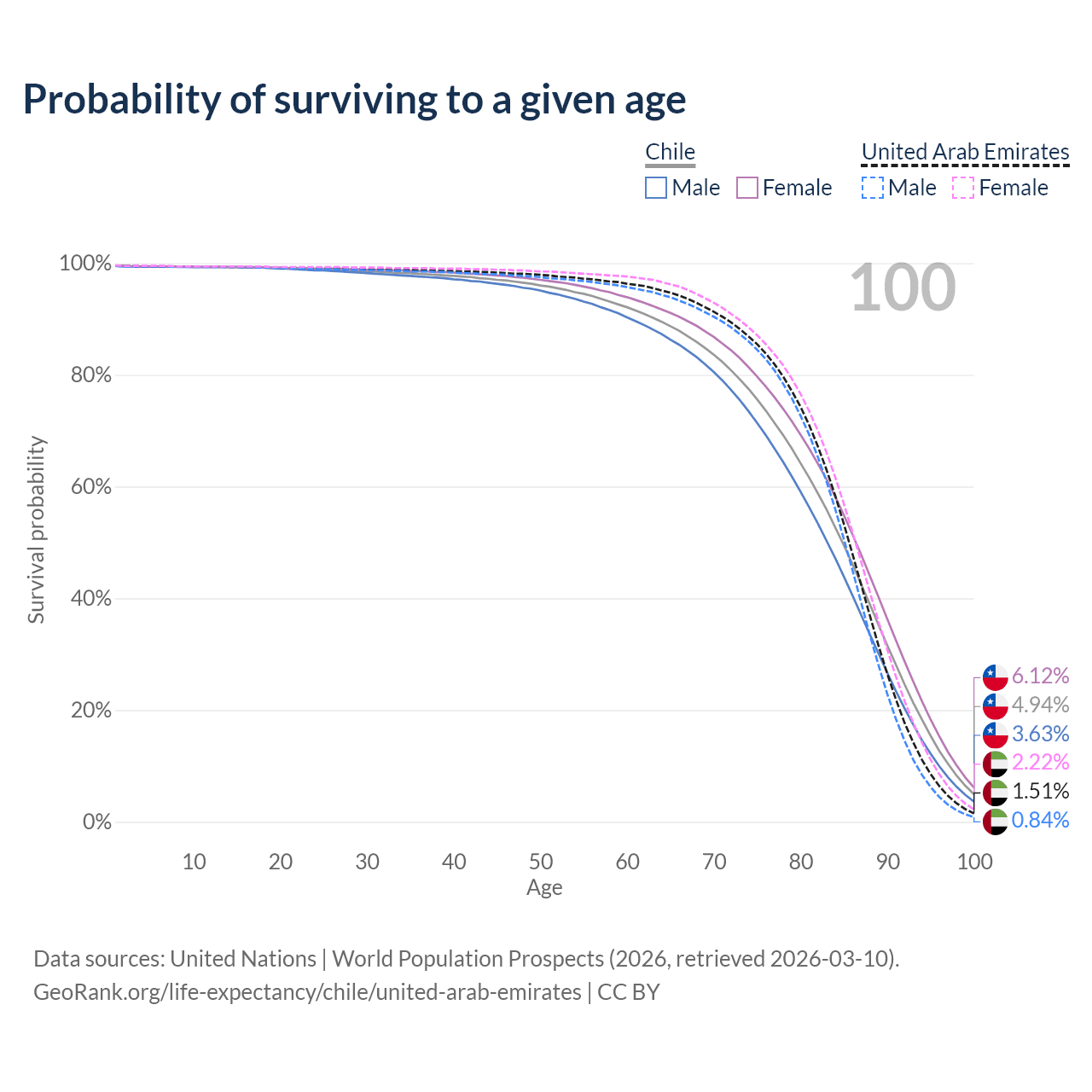 This life expectancy calculator shows the odds of living to 100, 95, 90, and below based on current age for both males and females in Chile and the United Arab Emirates, along with mean and median age of death. The calculations are based on the 2026 life tables (actuarial tables) from the UN World Population Prospects.