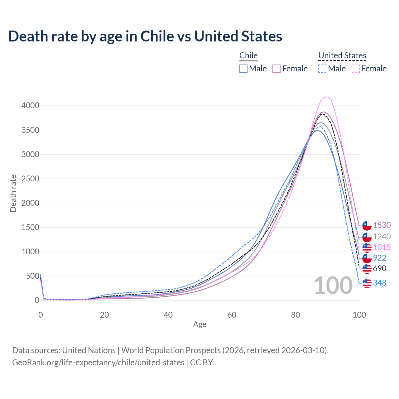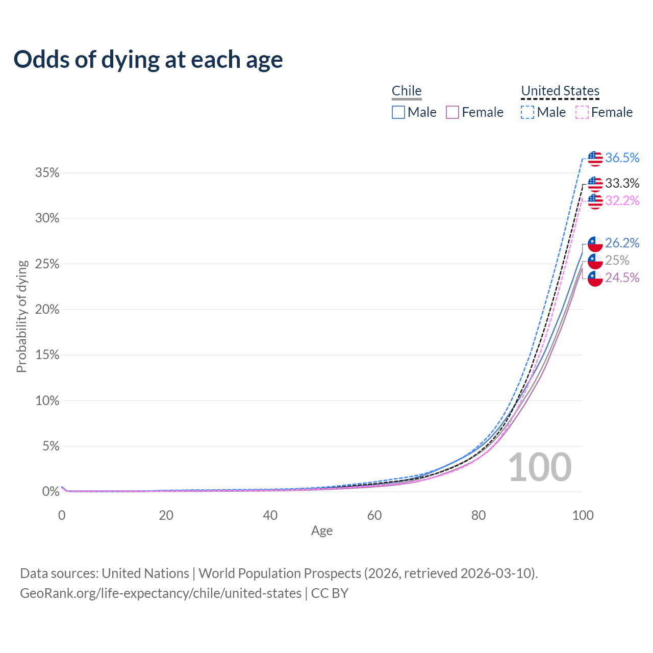 This life expectancy calculator shows the odds of living to 100, 95, 90, and below based on current age for both males and females in Chile and the United States, along with mean and median age of death. The calculations are based on the 2026 life tables (actuarial tables) from the UN World Population Prospects.