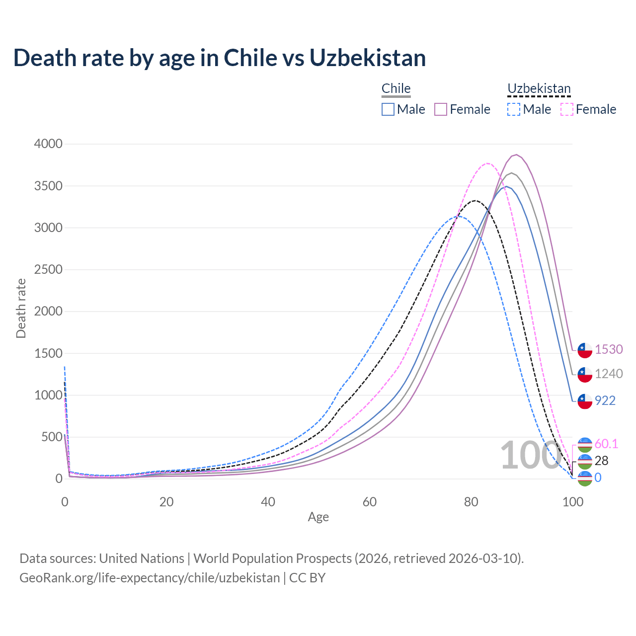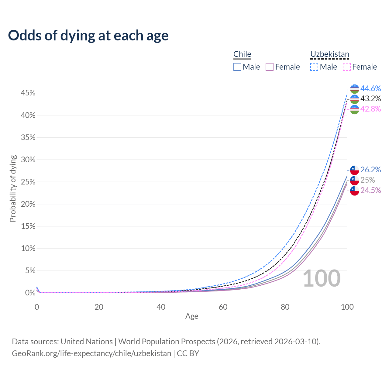 This life expectancy calculator shows the odds of living to 100, 95, 90, and below based on current age for both males and females in Chile and Uzbekistan, along with mean and median age of death. The calculations are based on the 2026 life tables (actuarial tables) from the UN World Population Prospects.
