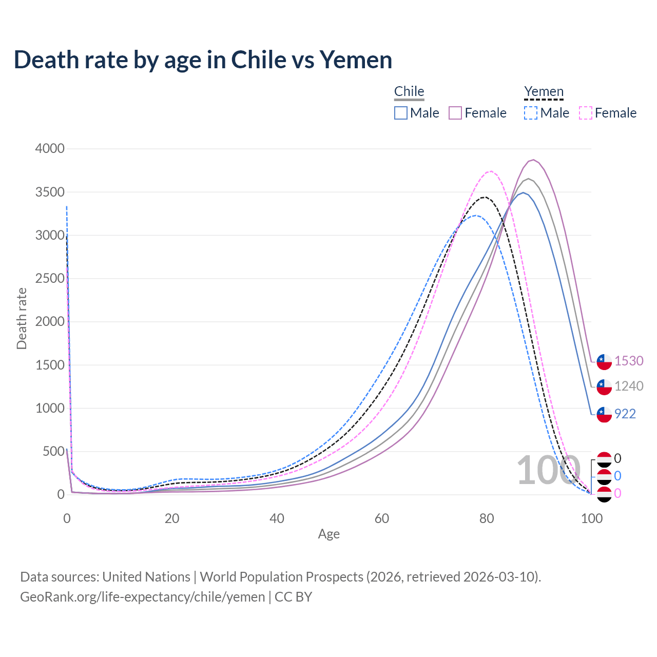 In Chile, the most common age of death is 88, compared to 80 in Yemen. The median age of death is 84.8 in Chile and 74.9 in Yemen, meaning only half of each cohort is expected to live past that age.