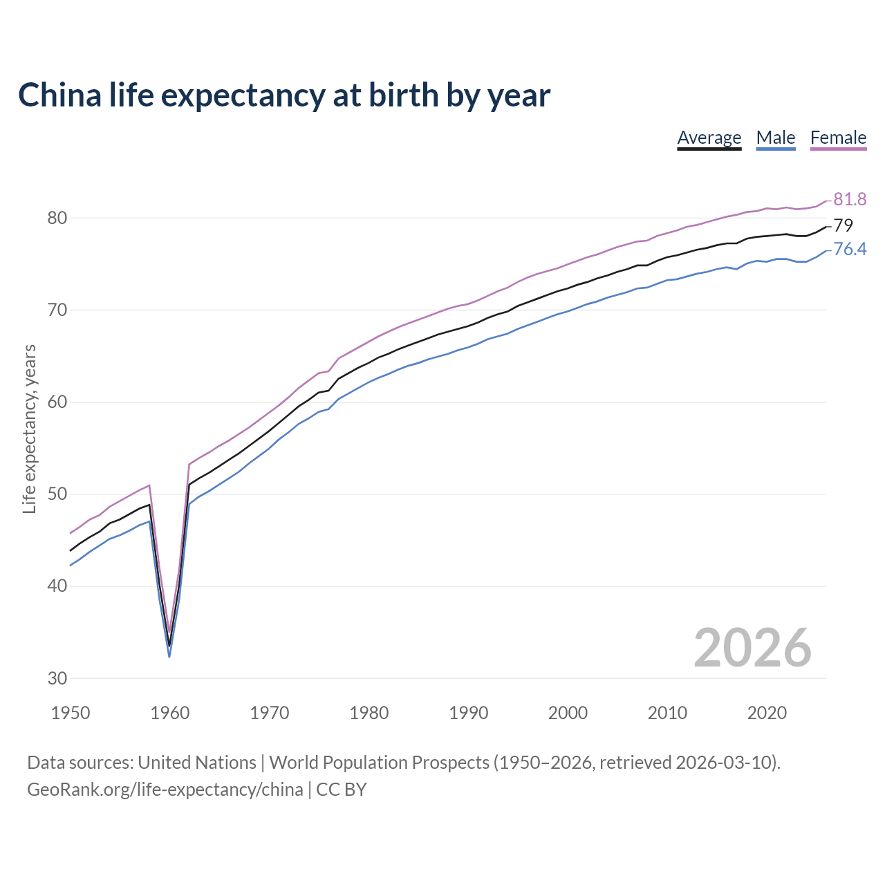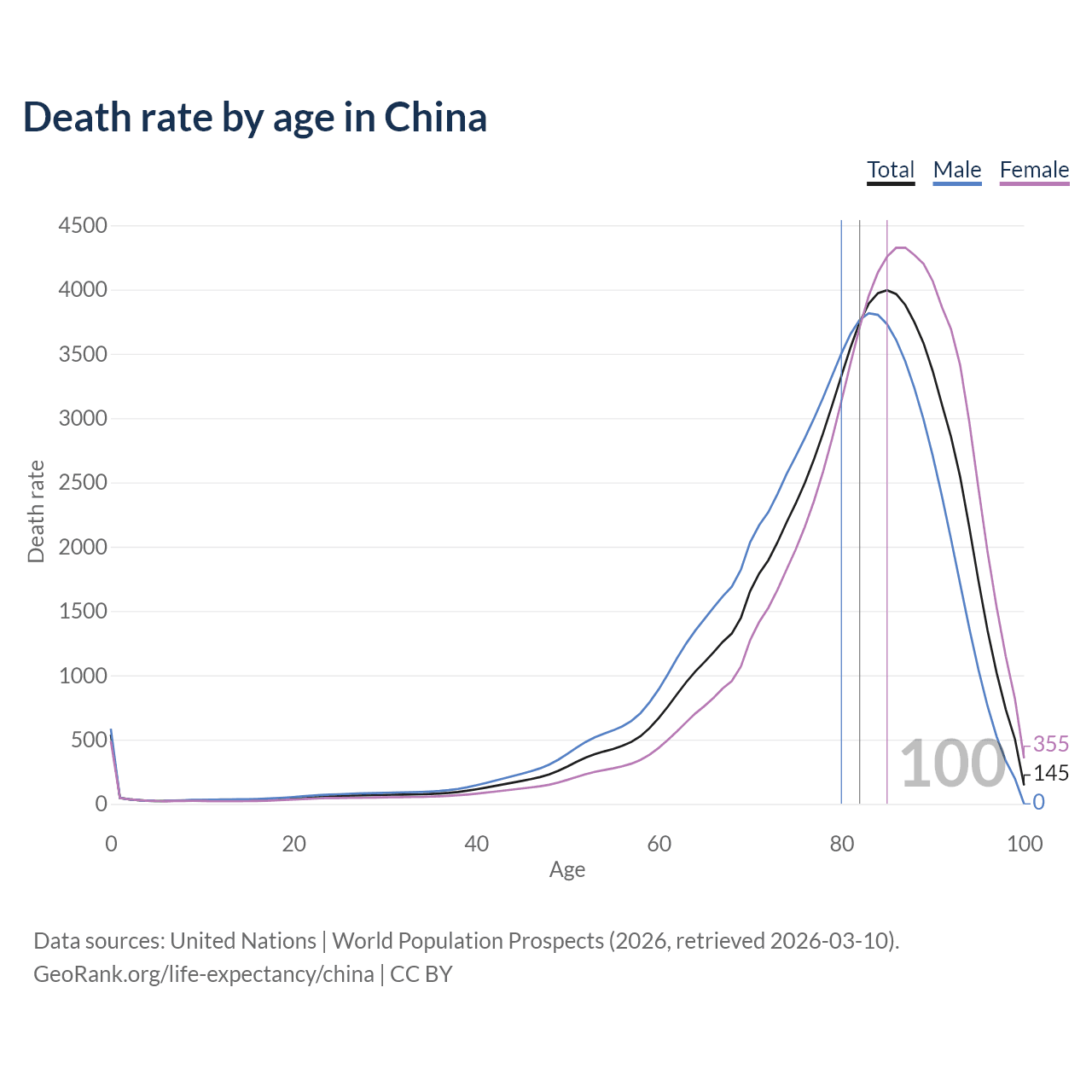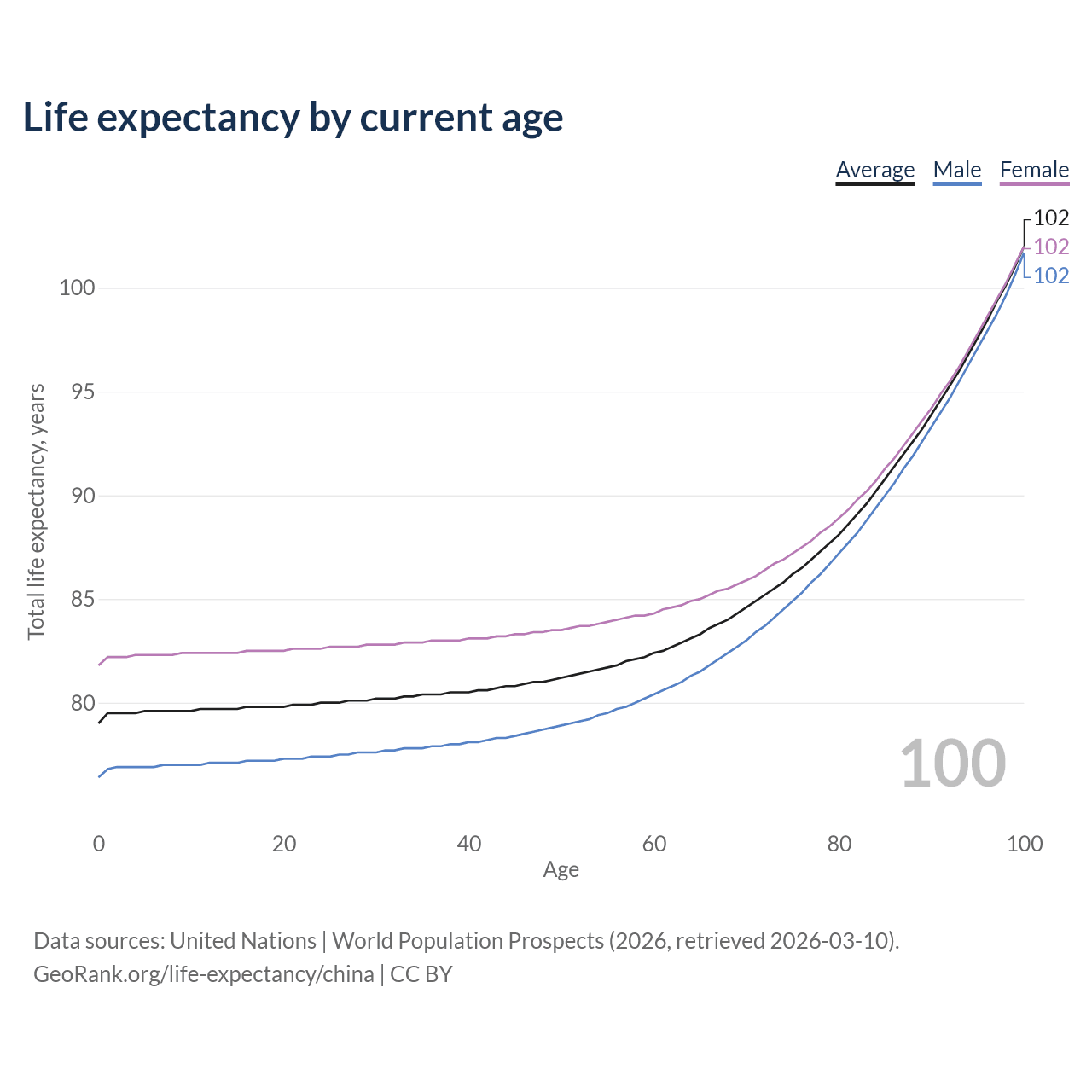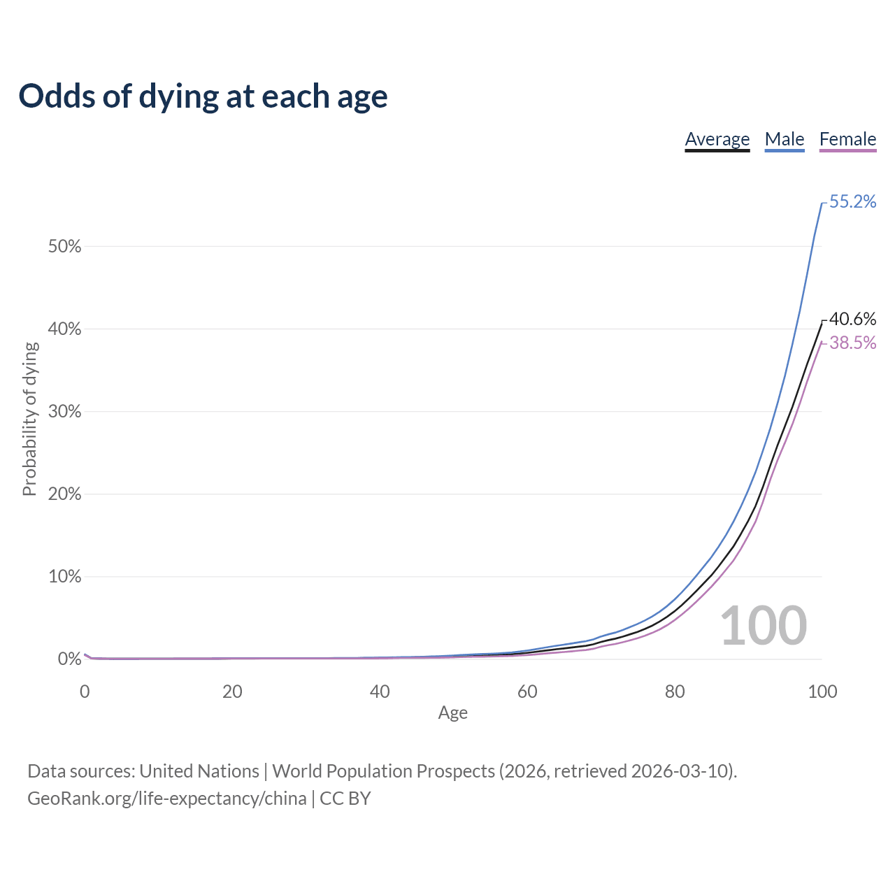 This life expectancy calculator shows the odds of living to 100, 95, 90, and below based on current age for both males and females in China, along with mean and median age of death. The calculations are based on the 2026 life tables (actuarial tables) from the UN World Population Prospects.