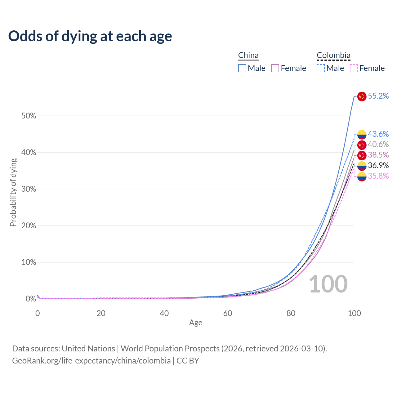 This life expectancy calculator shows the odds of living to 100, 95, 90, and below based on current age for both males and females in China and Colombia, along with mean and median age of death. The calculations are based on the 2026 life tables (actuarial tables) from the UN World Population Prospects.
