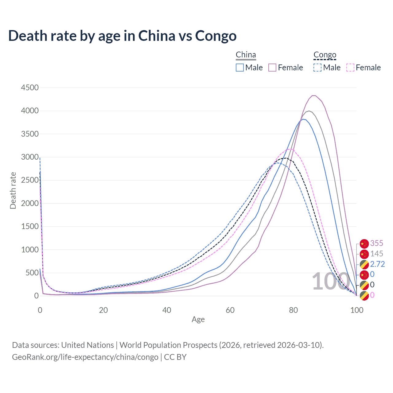 In China, the most common age of death is 85, compared to 78 in the Congo. The median age of death is 82.3 in China and 71.8 in the Congo, meaning only half of each cohort is expected to live past that age.