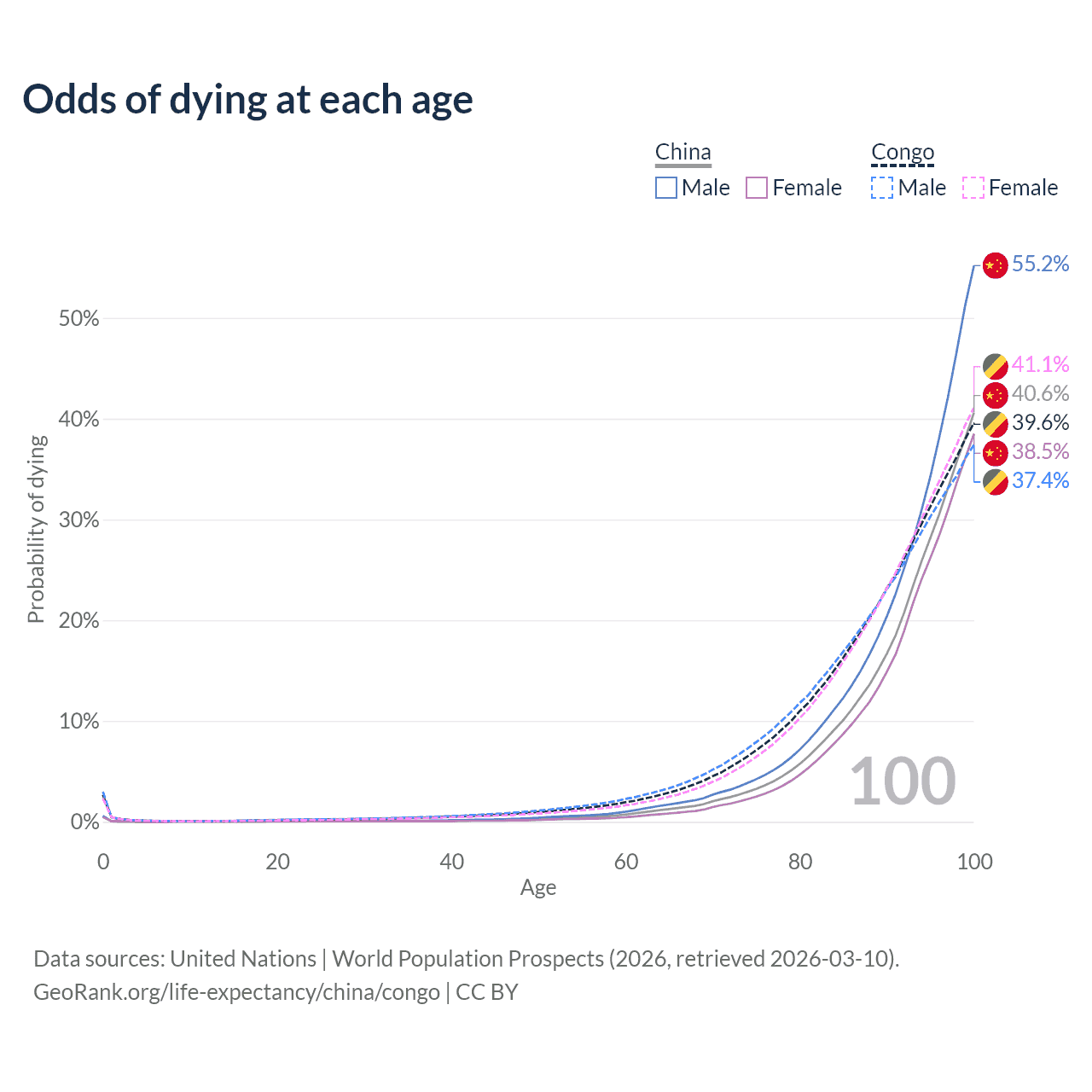 This life expectancy calculator shows the odds of living to 100, 95, 90, and below based on current age for both males and females in China and the Congo, along with mean and median age of death. The calculations are based on the 2026 life tables (actuarial tables) from the UN World Population Prospects.