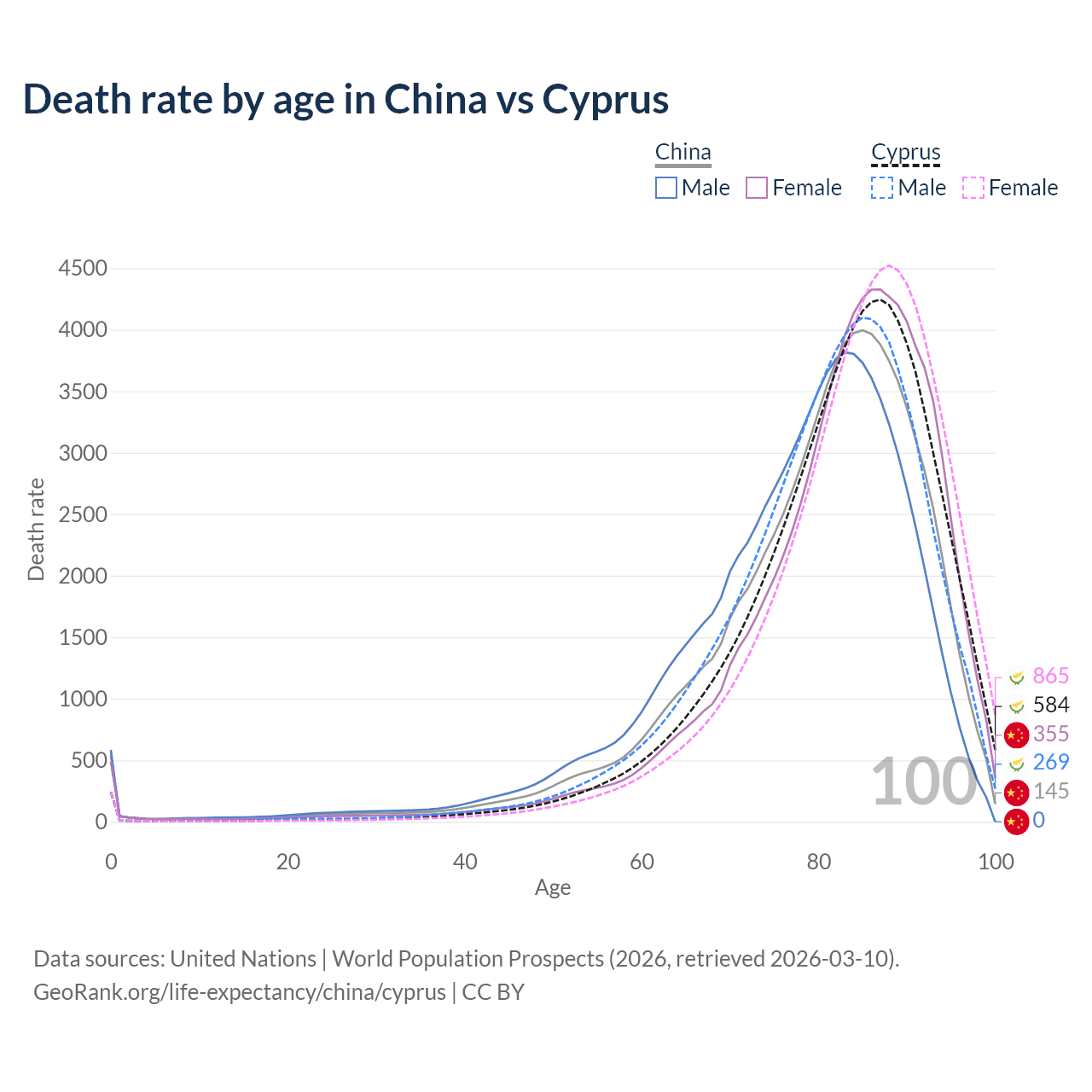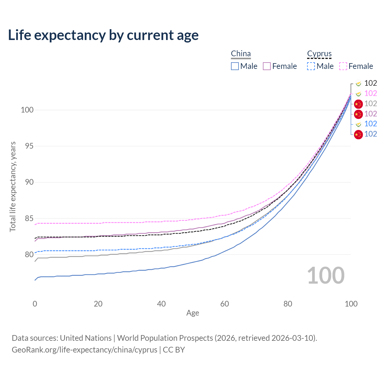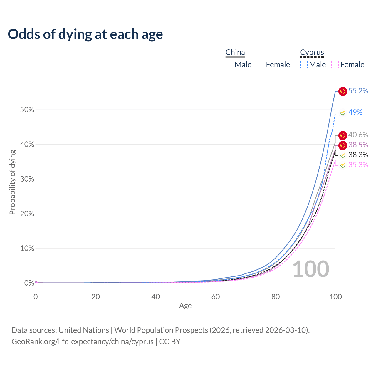 This life expectancy calculator shows the odds of living to 100, 95, 90, and below based on current age for both males and females in China and Cyprus, along with mean and median age of death. The calculations are based on the 2026 life tables (actuarial tables) from the UN World Population Prospects.
