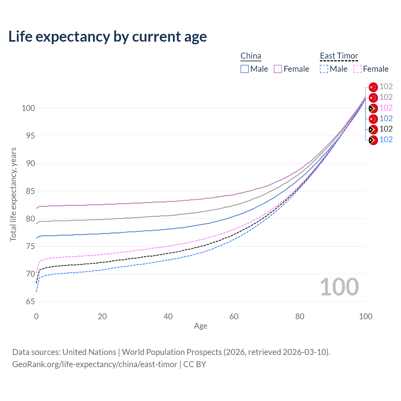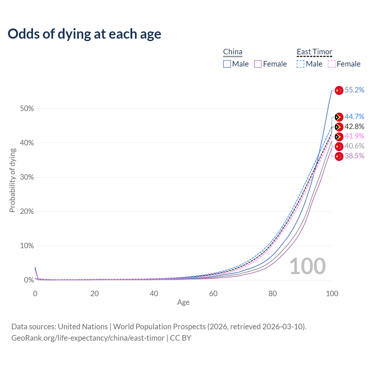This life expectancy calculator shows the odds of living to 100, 95, 90, and below based on current age for both males and females in China and East Timor, along with mean and median age of death. The calculations are based on the 2026 life tables (actuarial tables) from the UN World Population Prospects.