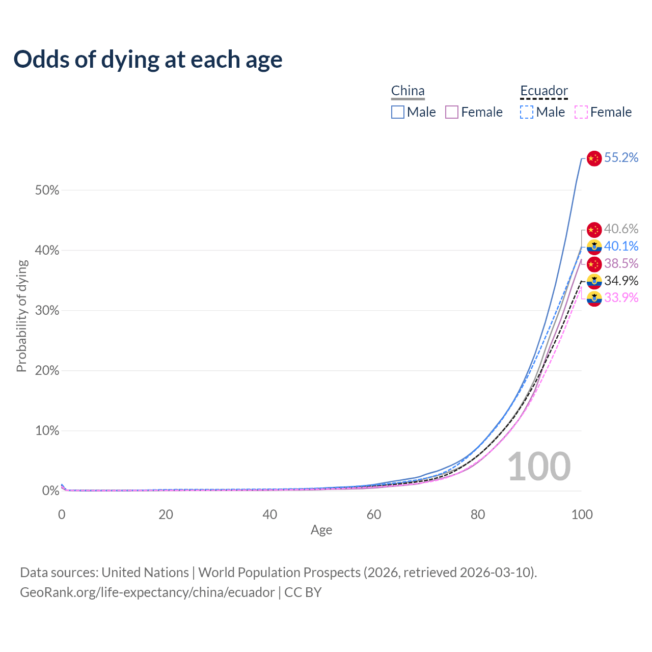 This life expectancy calculator shows the odds of living to 100, 95, 90, and below based on current age for both males and females in China and Ecuador, along with mean and median age of death. The calculations are based on the 2026 life tables (actuarial tables) from the UN World Population Prospects.