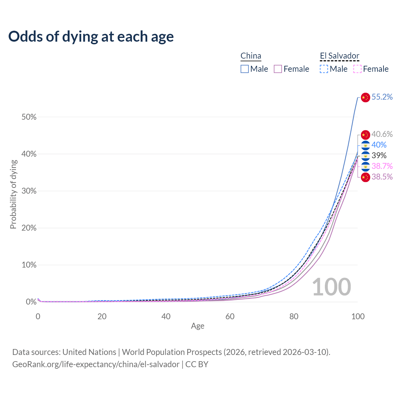This life expectancy calculator shows the odds of living to 100, 95, 90, and below based on current age for both males and females in China and El Salvador, along with mean and median age of death. The calculations are based on the 2026 life tables (actuarial tables) from the UN World Population Prospects.