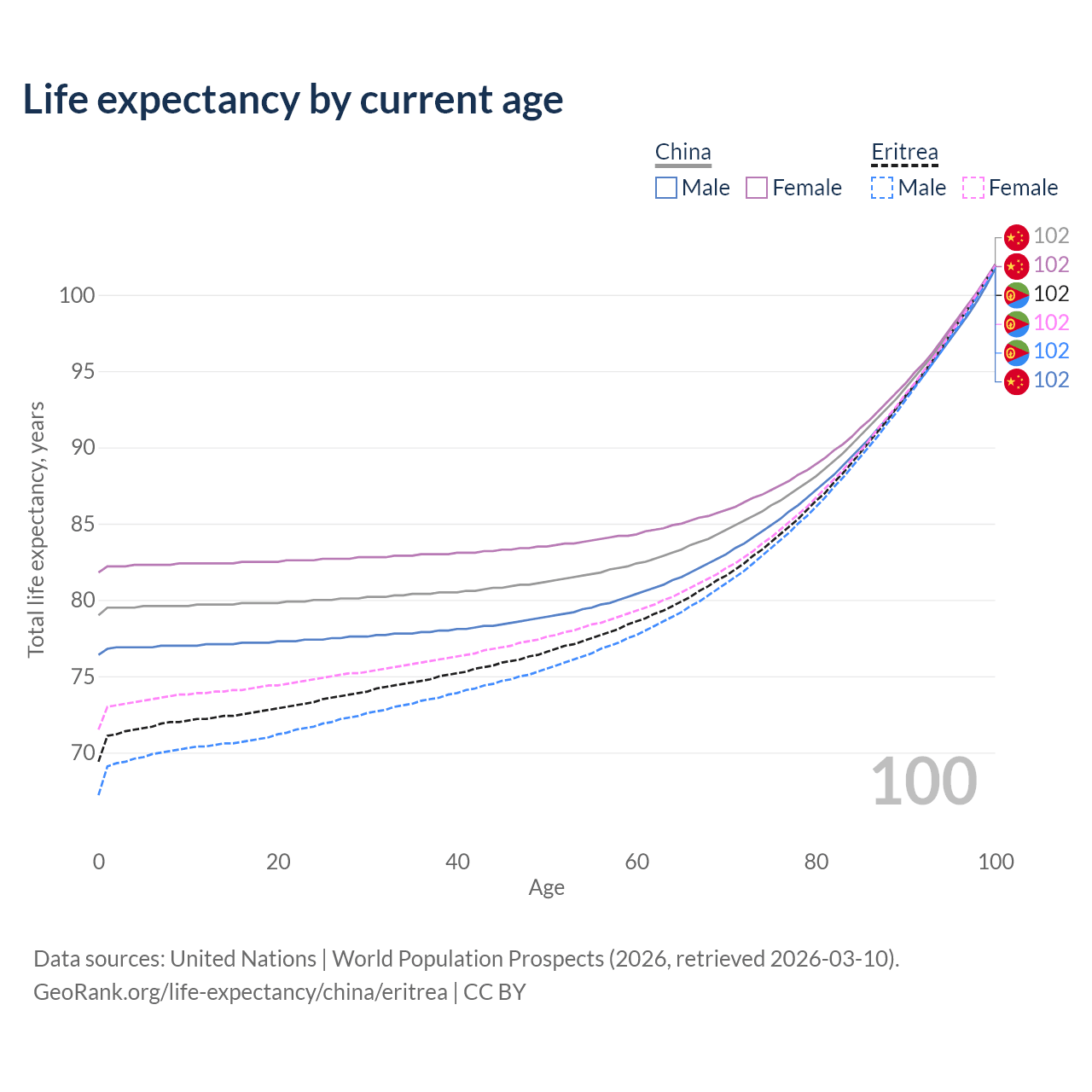 This life expectancy calculator shows the odds of living to 100, 95, 90, and below based on current age for both males and females in China and Eritrea, along with mean and median age of death. The calculations are based on the 2026 life tables (actuarial tables) from the UN World Population Prospects.