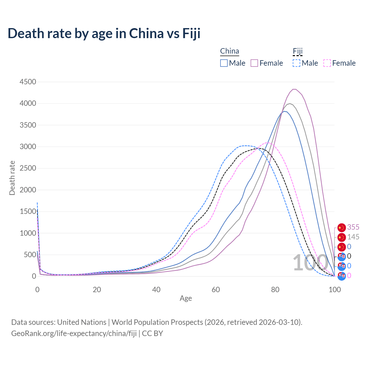 In China, the most common age of death is 85, compared to 74 in Fiji. The median age of death is 82.3 in China and 70.5 in Fiji, meaning only half of each cohort is expected to live past that age.