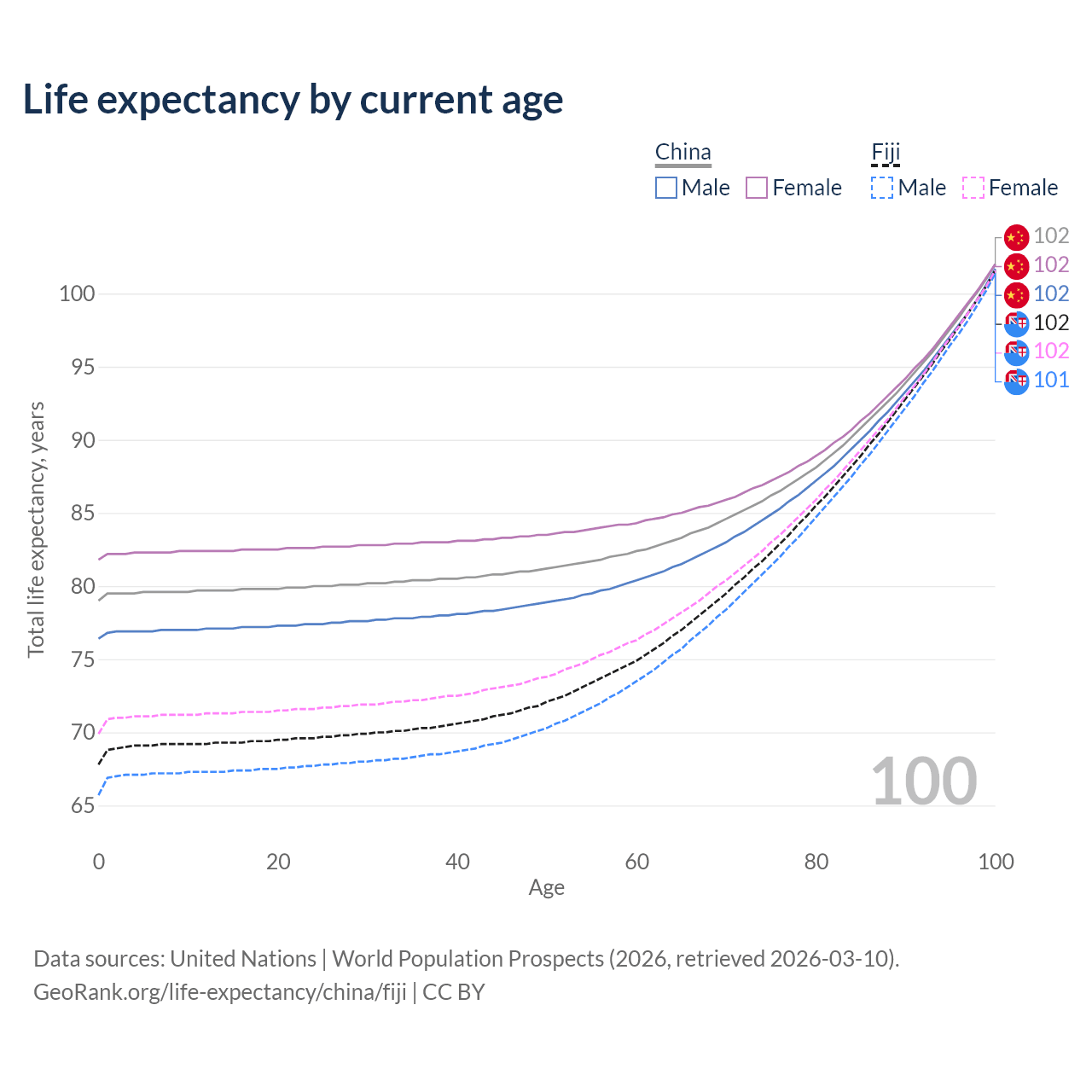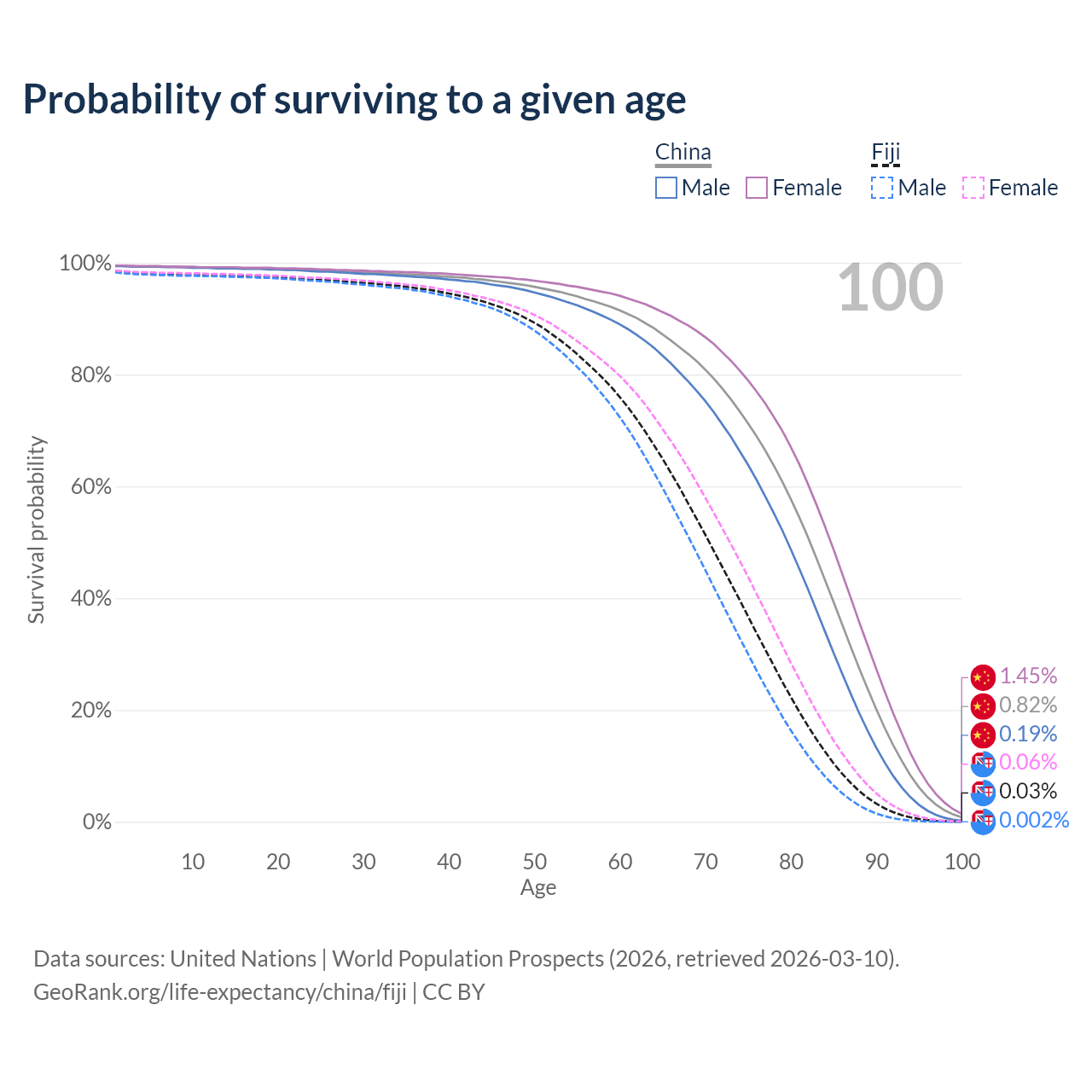 This life expectancy calculator shows the odds of living to 100, 95, 90, and below based on current age for both males and females in China and Fiji, along with mean and median age of death. The calculations are based on the 2026 life tables (actuarial tables) from the UN World Population Prospects.