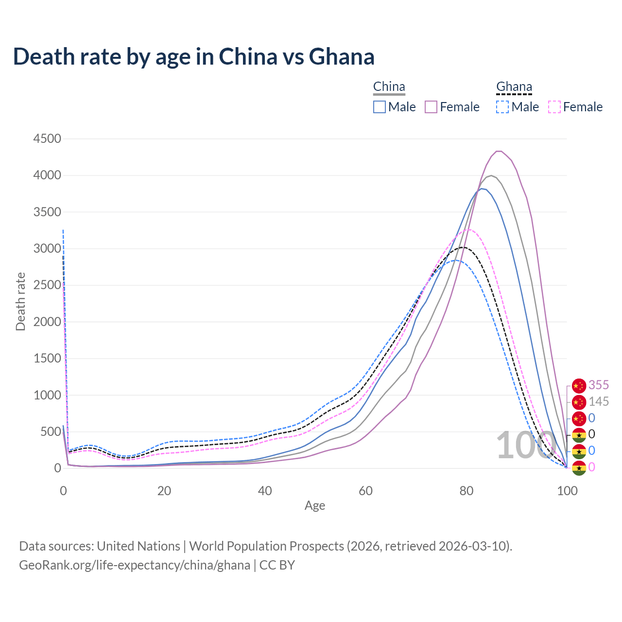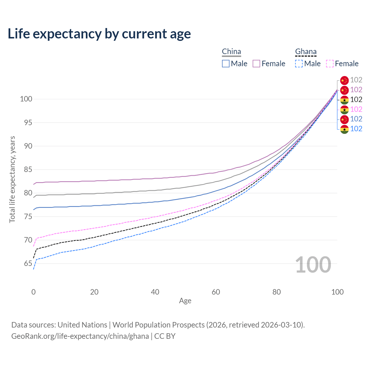 This life expectancy calculator shows the odds of living to 100, 95, 90, and below based on current age for both males and females in China and Ghana, along with mean and median age of death. The calculations are based on the 2026 life tables (actuarial tables) from the UN World Population Prospects.