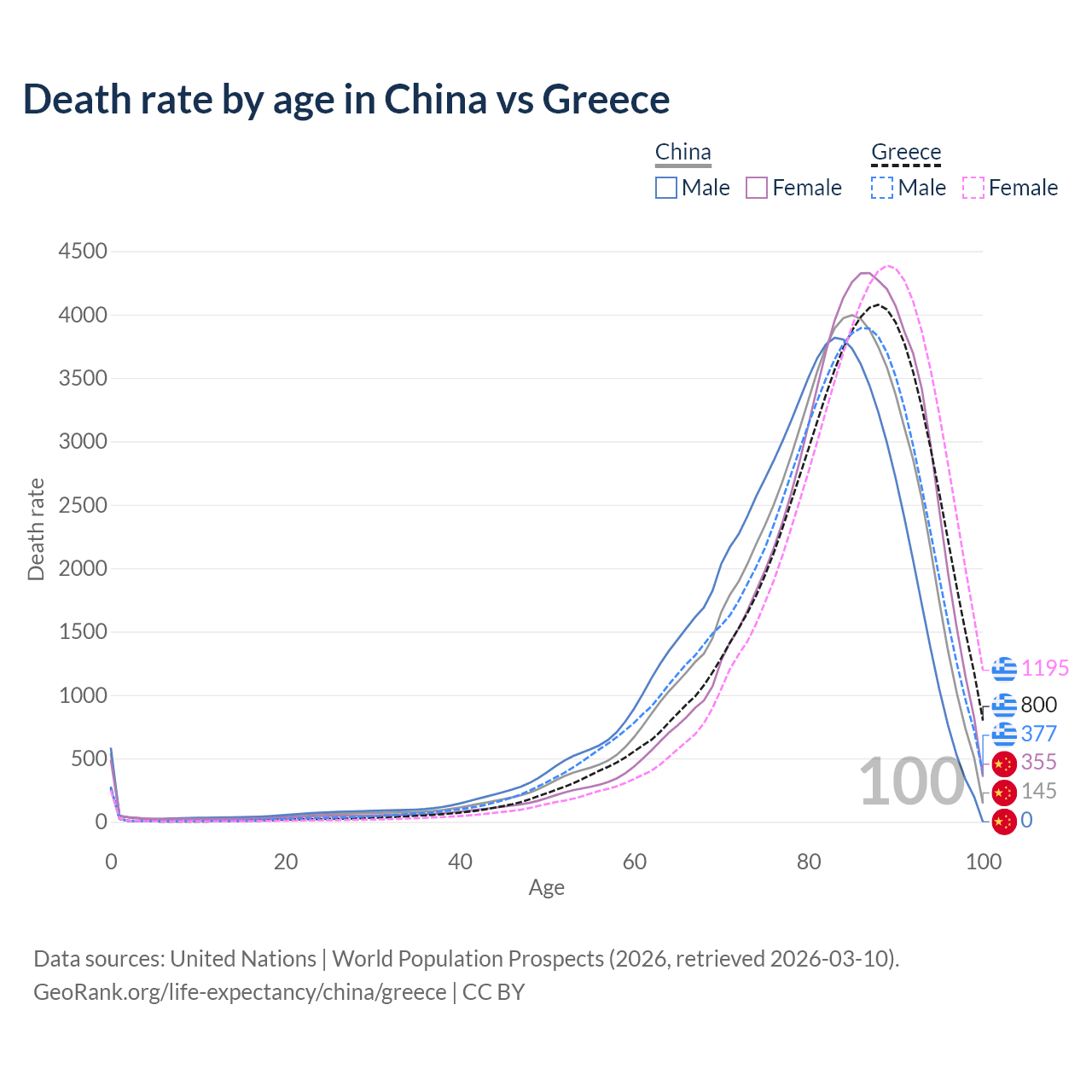 In China, the most common age of death is 85, compared to 88 in Greece. The median age of death is 82.3 in China and 84.9 in Greece, meaning only half of each cohort is expected to live past that age.