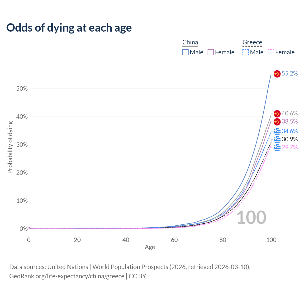 This life expectancy calculator shows the odds of living to 100, 95, 90, and below based on current age for both males and females in China and Greece, along with mean and median age of death. The calculations are based on the 2026 life tables (actuarial tables) from the UN World Population Prospects.