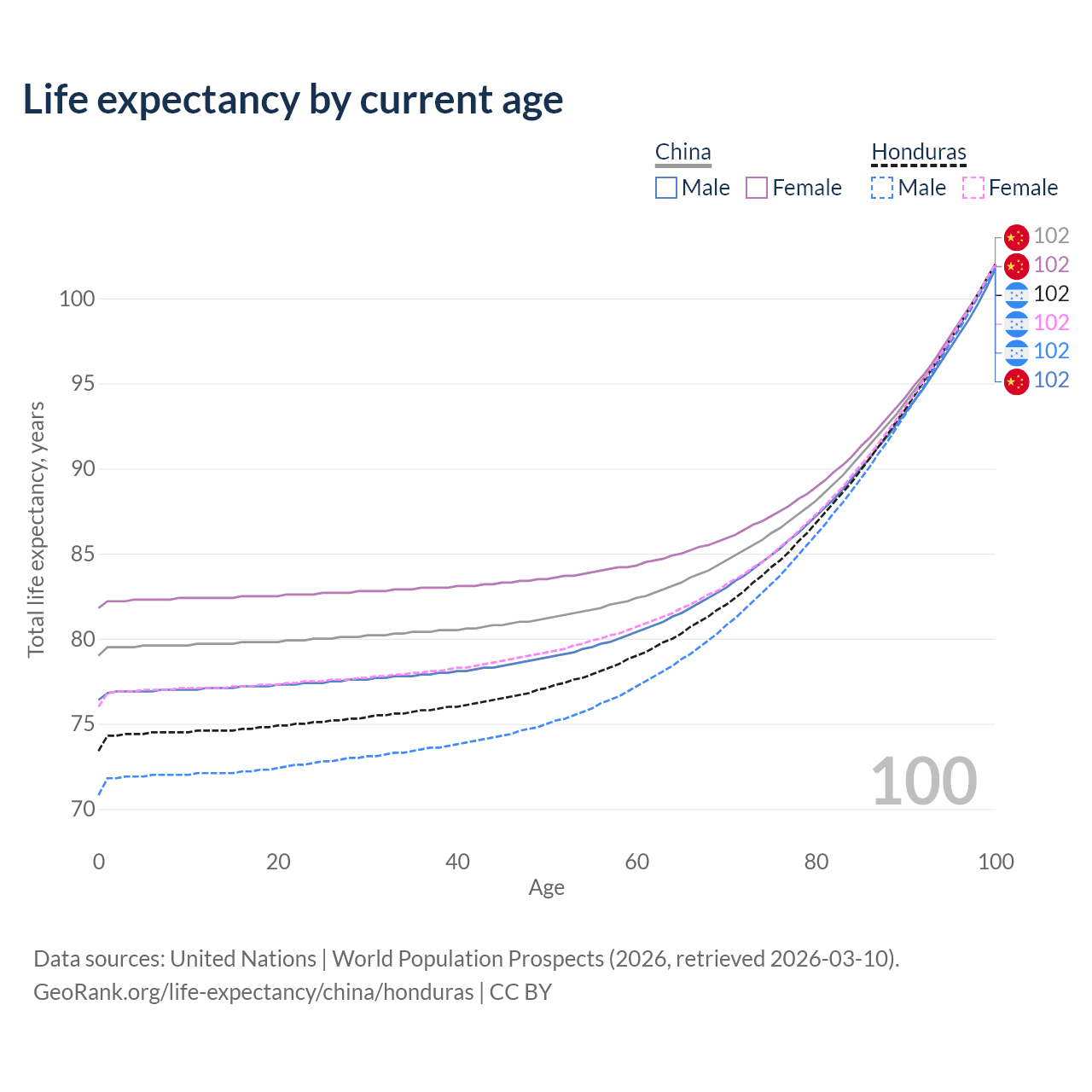 This life expectancy calculator shows the odds of living to 100, 95, 90, and below based on current age for both males and females in China and Honduras, along with mean and median age of death. The calculations are based on the 2026 life tables (actuarial tables) from the UN World Population Prospects.