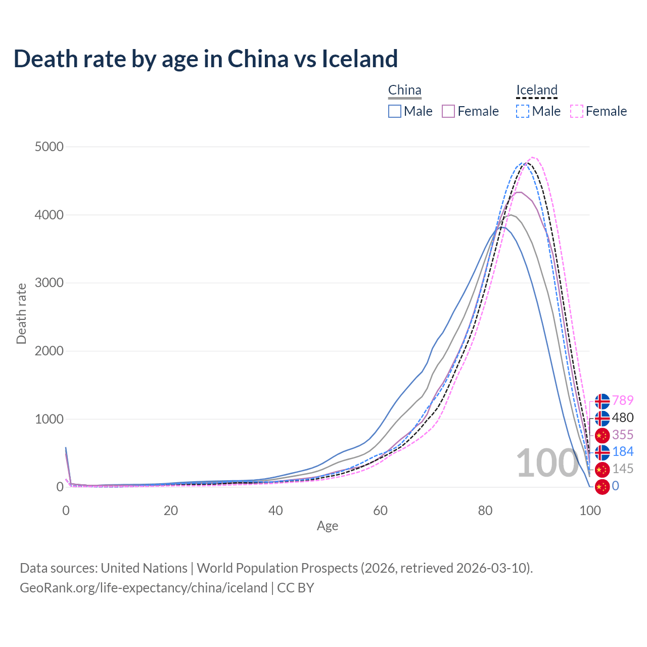 In China, the most common age of death is 85, compared to 88 in Iceland. The median age of death is 82.3 in China and 85.9 in Iceland, meaning only half of each cohort is expected to live past that age.