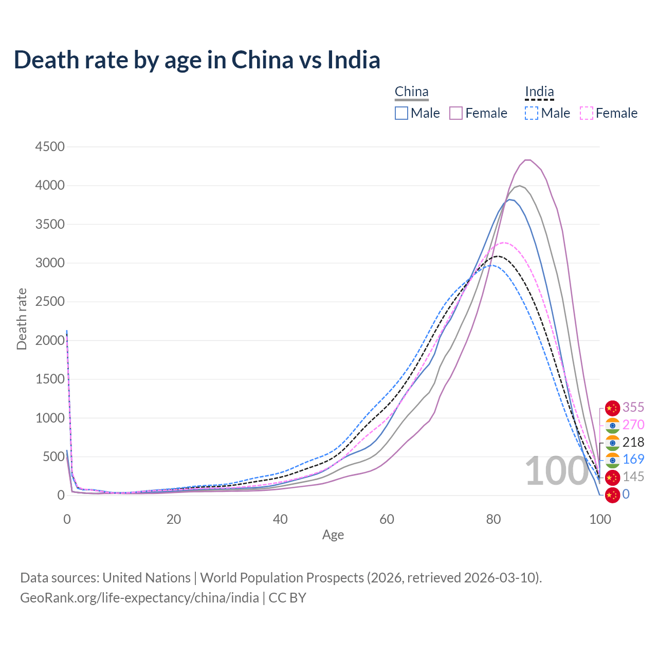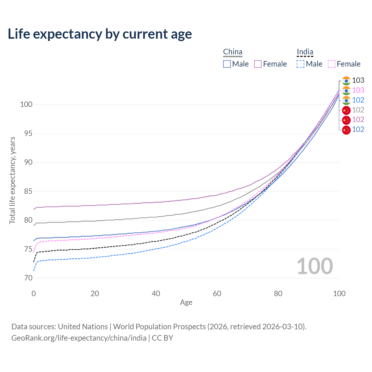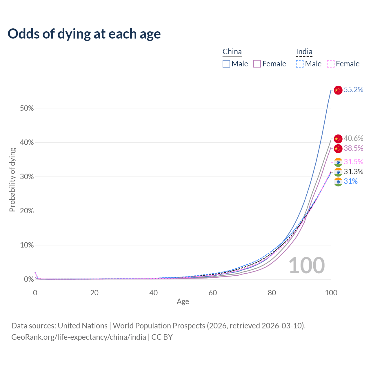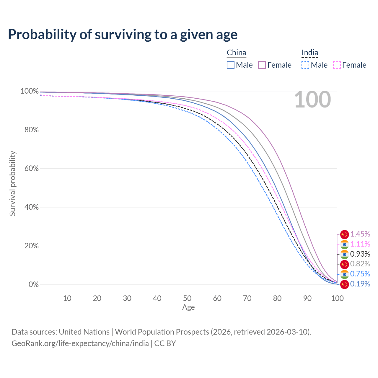 This life expectancy calculator shows the odds of living to 100, 95, 90, and below based on current age for both males and females in China and India, along with mean and median age of death. The calculations are based on the 2026 life tables (actuarial tables) from the UN World Population Prospects.