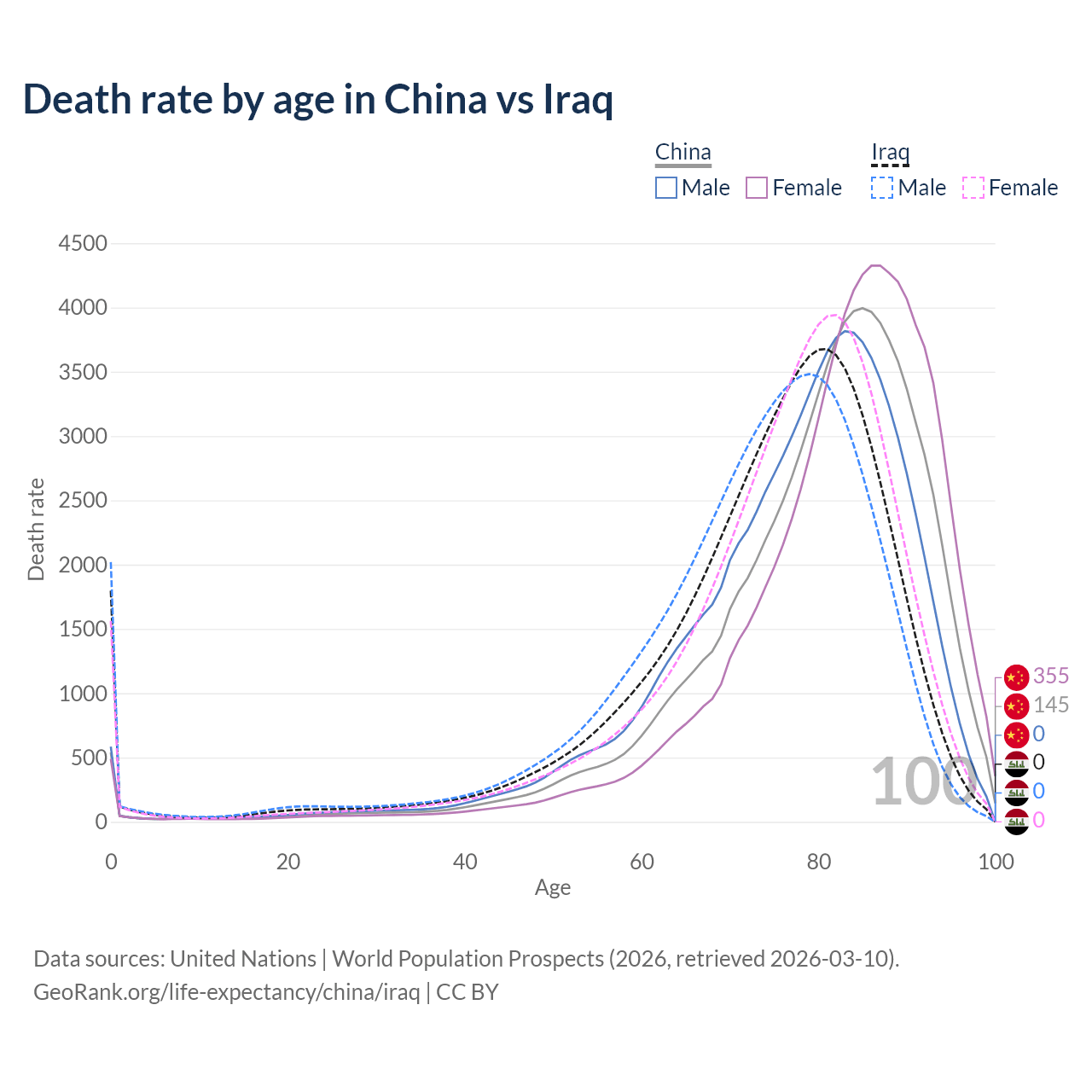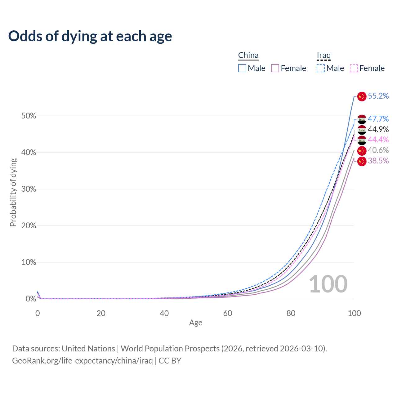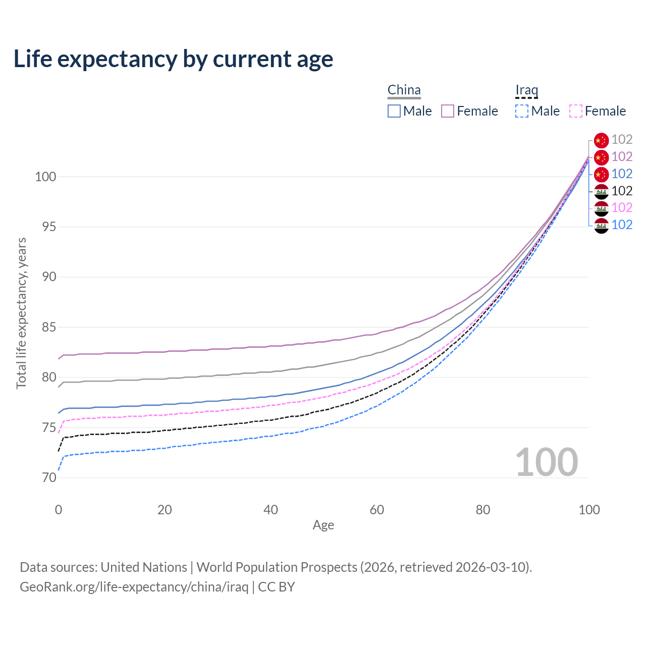 This life expectancy calculator shows the odds of living to 100, 95, 90, and below based on current age for both males and females in China and Iraq, along with mean and median age of death. The calculations are based on the 2026 life tables (actuarial tables) from the UN World Population Prospects.