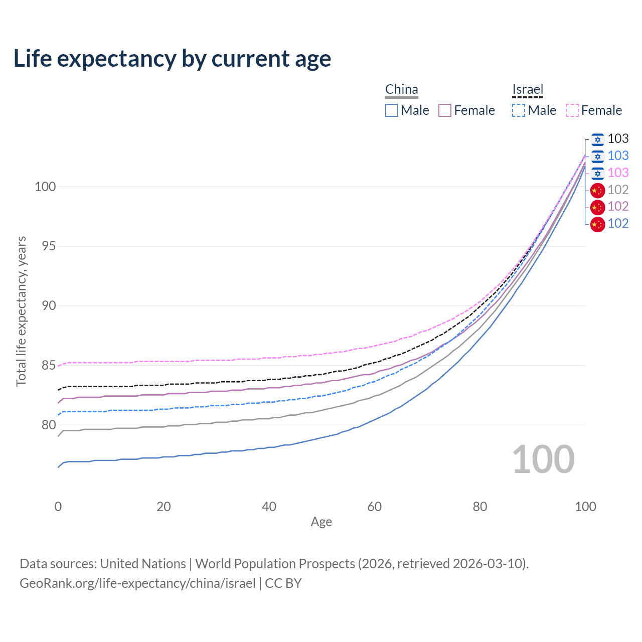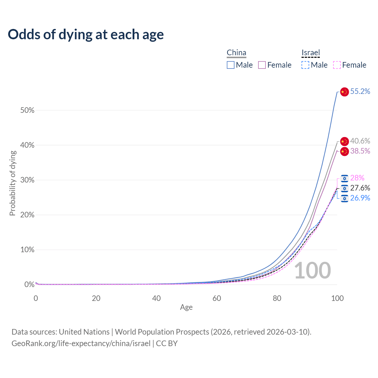 This life expectancy calculator shows the odds of living to 100, 95, 90, and below based on current age for both males and females in China and Israel, along with mean and median age of death. The calculations are based on the 2026 life tables (actuarial tables) from the UN World Population Prospects.