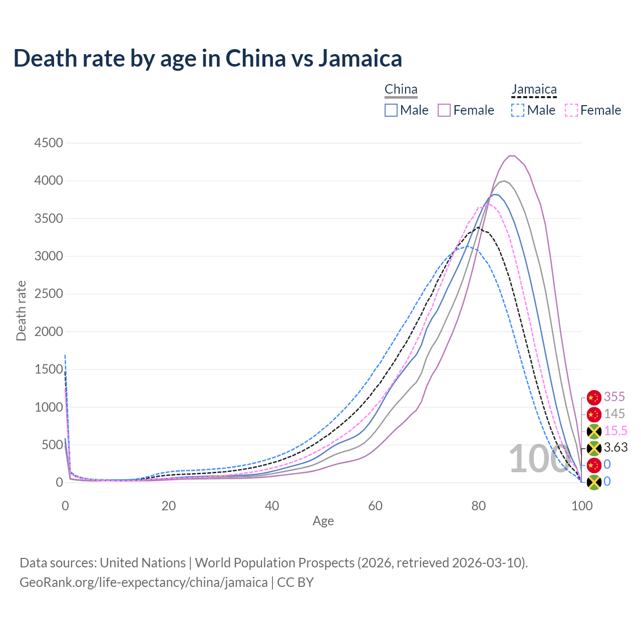 This life expectancy calculator shows the odds of living to 100, 95, 90, and below based on current age for both males and females in China and Jamaica, along with mean and median age of death. The calculations are based on the 2026 life tables (actuarial tables) from the UN World Population Prospects.