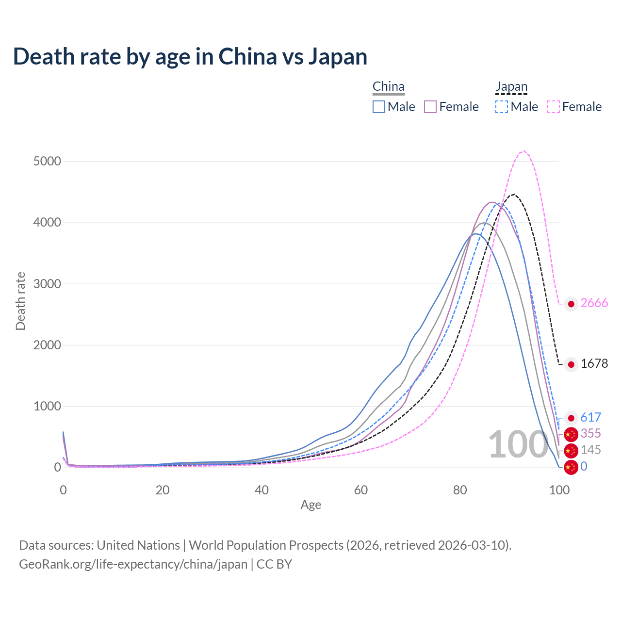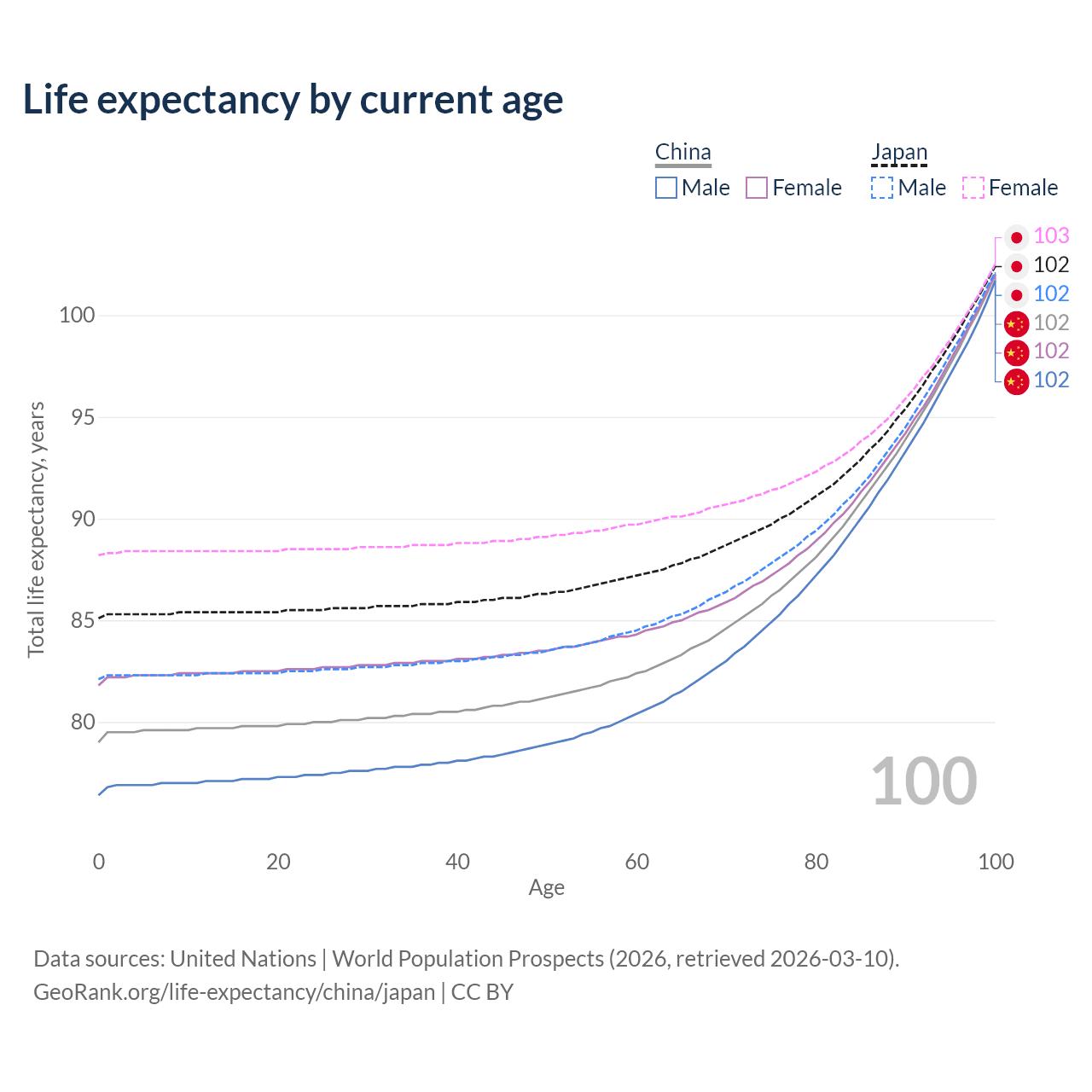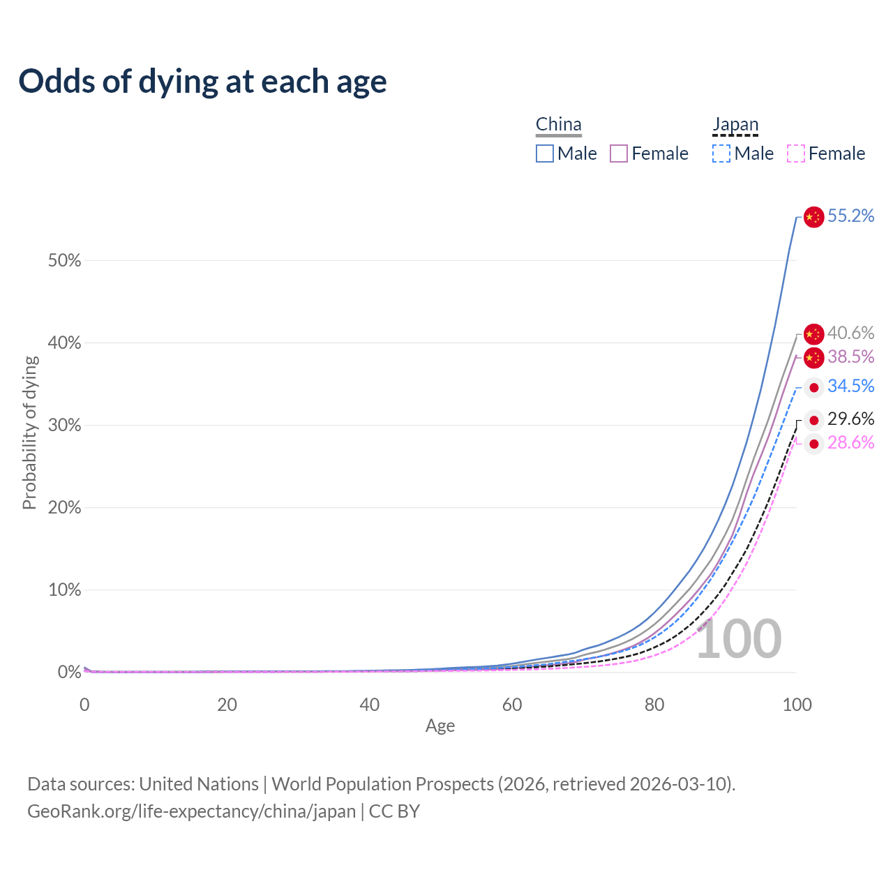This life expectancy calculator shows the odds of living to 100, 95, 90, and below based on current age for both males and females in China and Japan, along with mean and median age of death. The calculations are based on the 2026 life tables (actuarial tables) from the UN World Population Prospects.