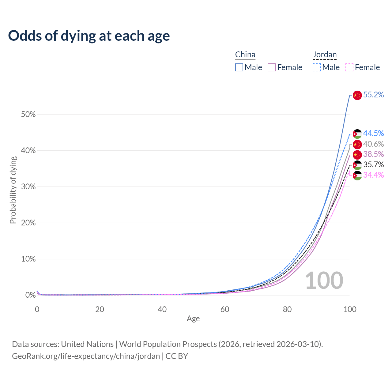 This life expectancy calculator shows the odds of living to 100, 95, 90, and below based on current age for both males and females in China and Jordan, along with mean and median age of death. The calculations are based on the 2026 life tables (actuarial tables) from the UN World Population Prospects.