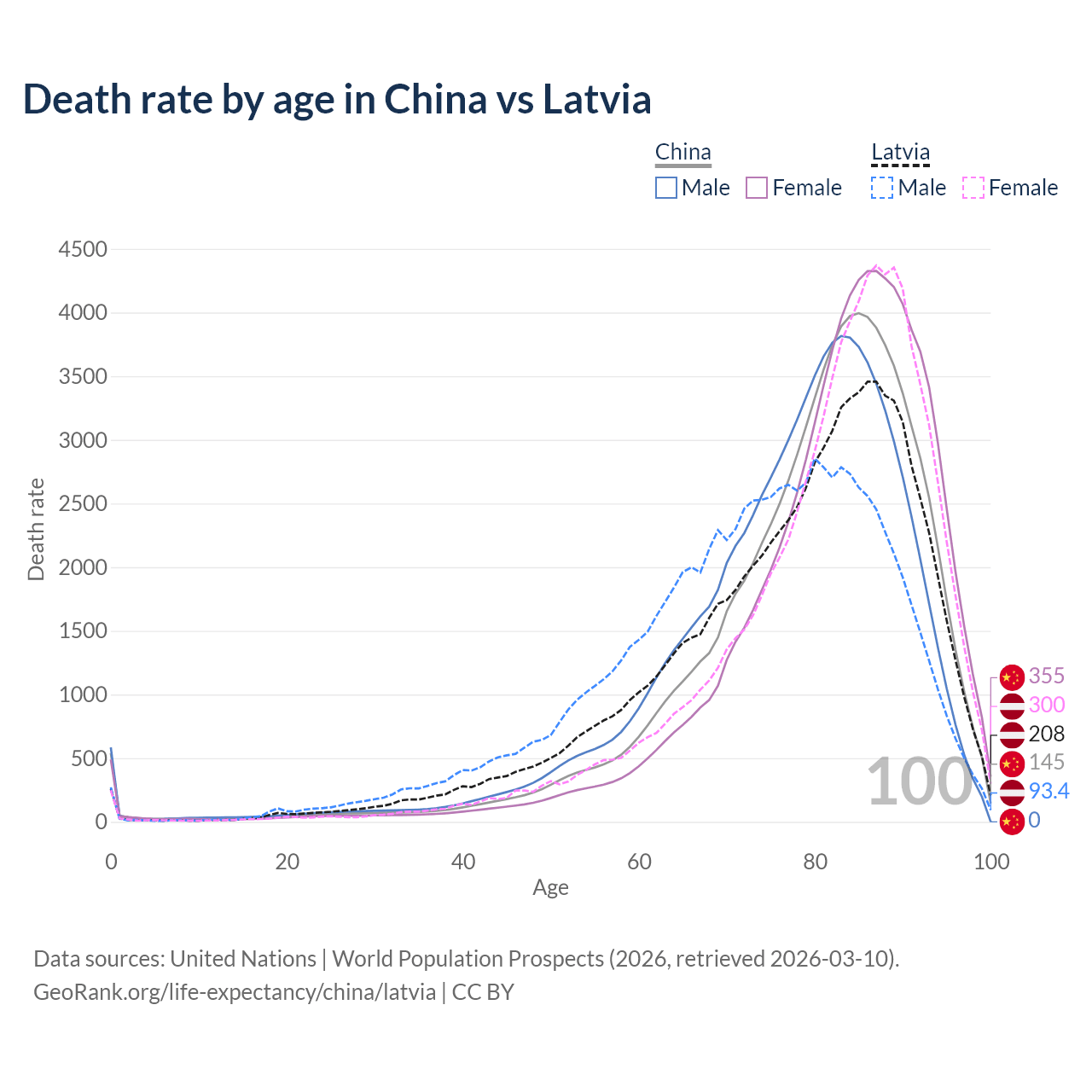 In China, the most common age of death is 85, compared to 87 in Latvia. The median age of death is 82.3 in China and 80.4 in Latvia, meaning only half of each cohort is expected to live past that age.