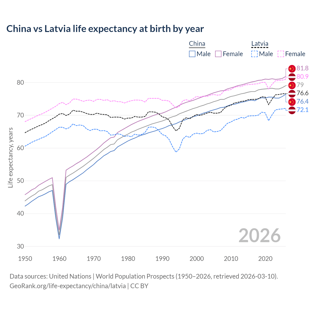 The average life expectancy at birth is 79 years in China vs 76.6 in Latvia. China is ranked 52/197 by life expectancy, and Latvia is 78/197. In China, the life expectancy is 76.4 years for males and 81.8 years for females. In Latvia, it's 72.1 years for males and 80.9 years for females.