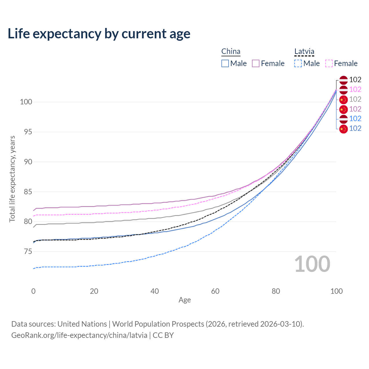 This life expectancy calculator shows the odds of living to 100, 95, 90, and below based on current age for both males and females in China and Latvia, along with mean and median age of death. The calculations are based on the 2026 life tables (actuarial tables) from the UN World Population Prospects.