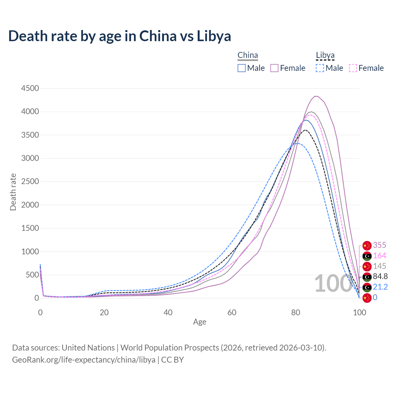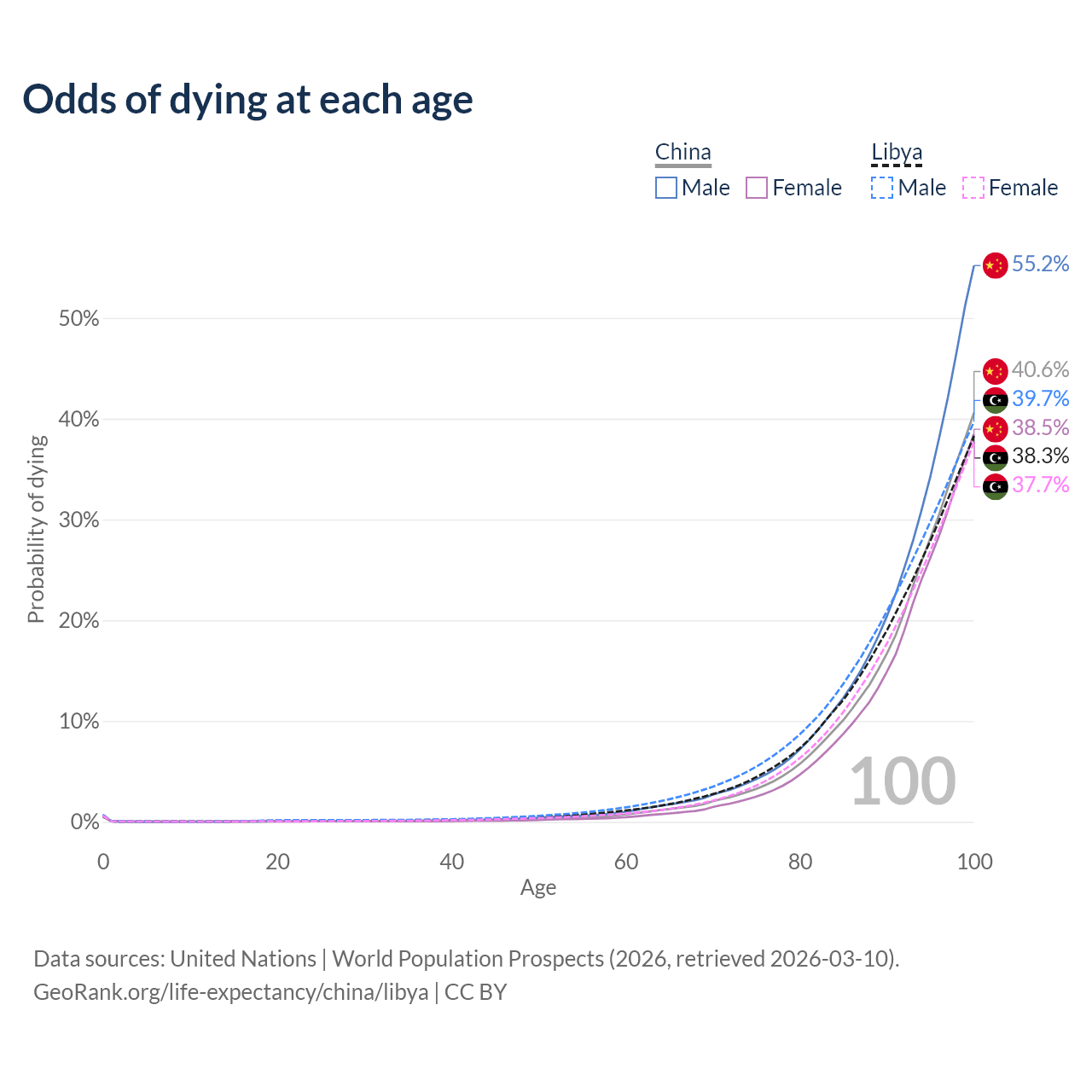 This life expectancy calculator shows the odds of living to 100, 95, 90, and below based on current age for both males and females in China and Libya, along with mean and median age of death. The calculations are based on the 2026 life tables (actuarial tables) from the UN World Population Prospects.