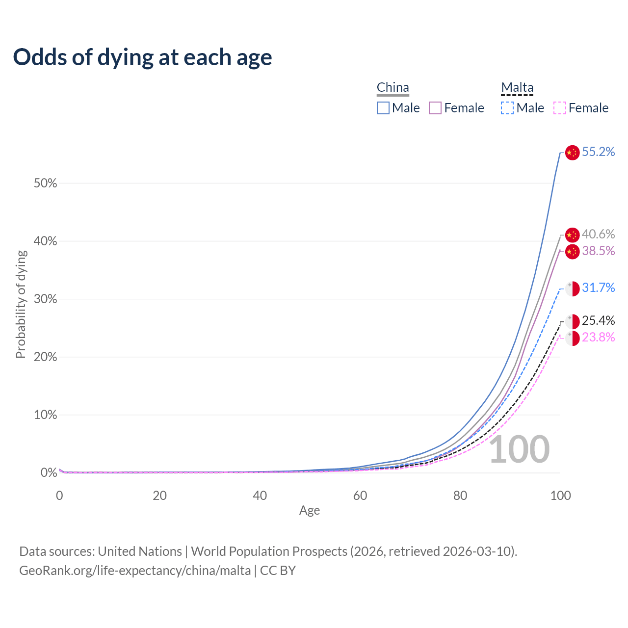 This life expectancy calculator shows the odds of living to 100, 95, 90, and below based on current age for both males and females in China and Malta, along with mean and median age of death. The calculations are based on the 2026 life tables (actuarial tables) from the UN World Population Prospects.