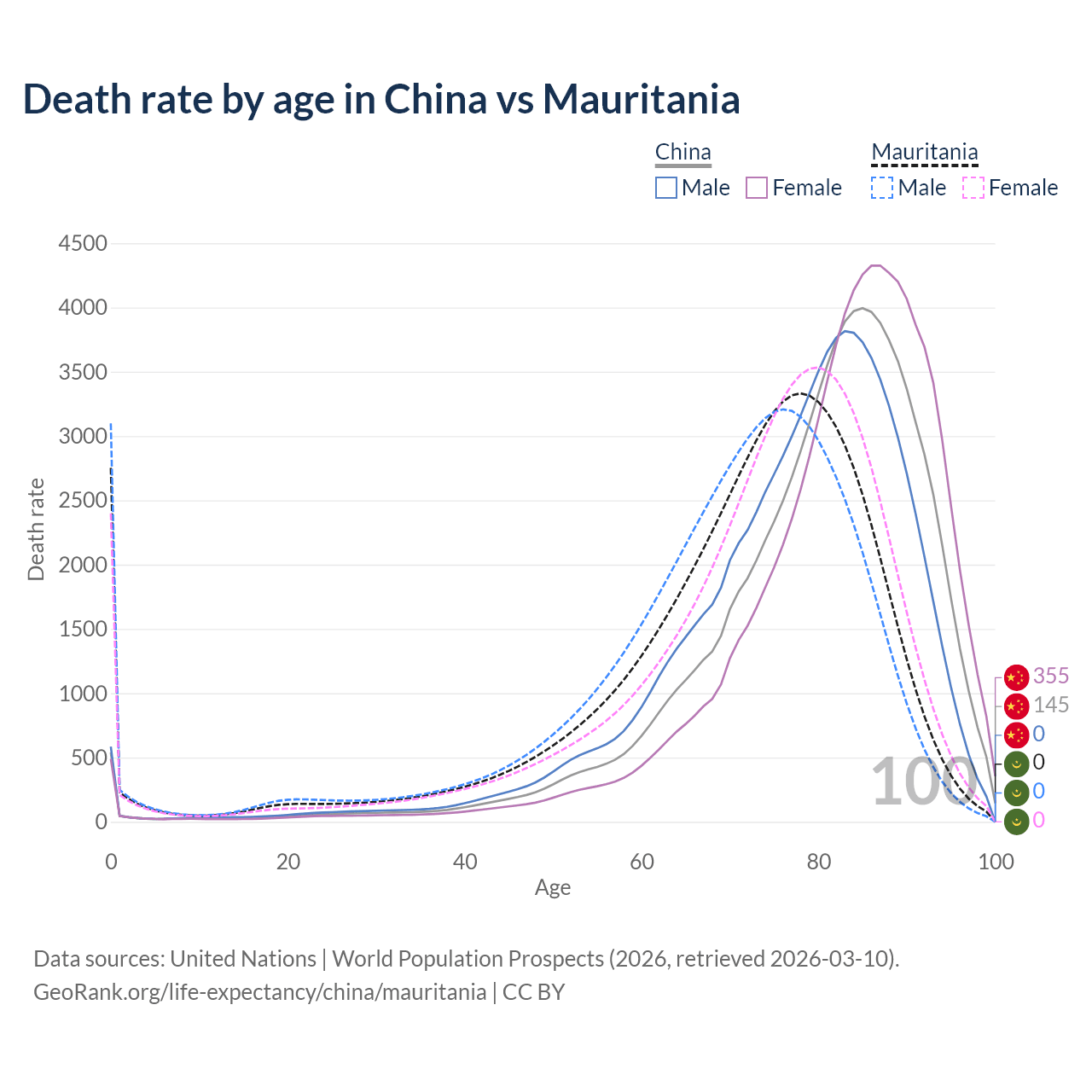 In China, the most common age of death is 85, compared to 78 in Mauritania. The median age of death is 82.3 in China and 74.1 in Mauritania, meaning only half of each cohort is expected to live past that age.
