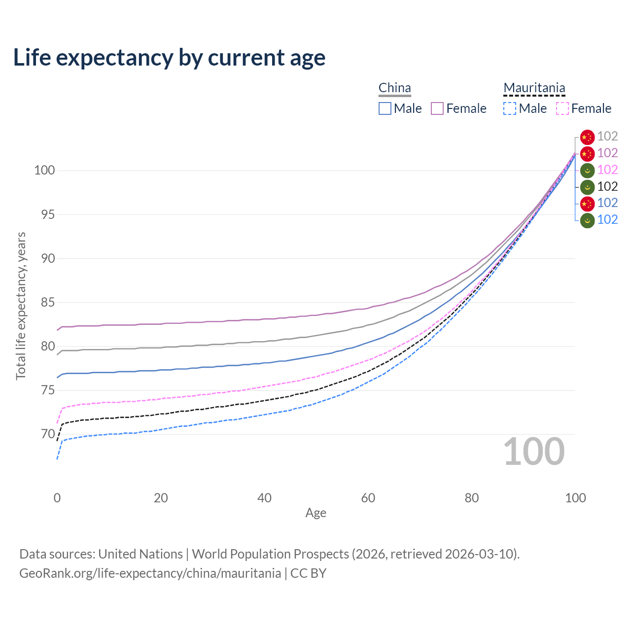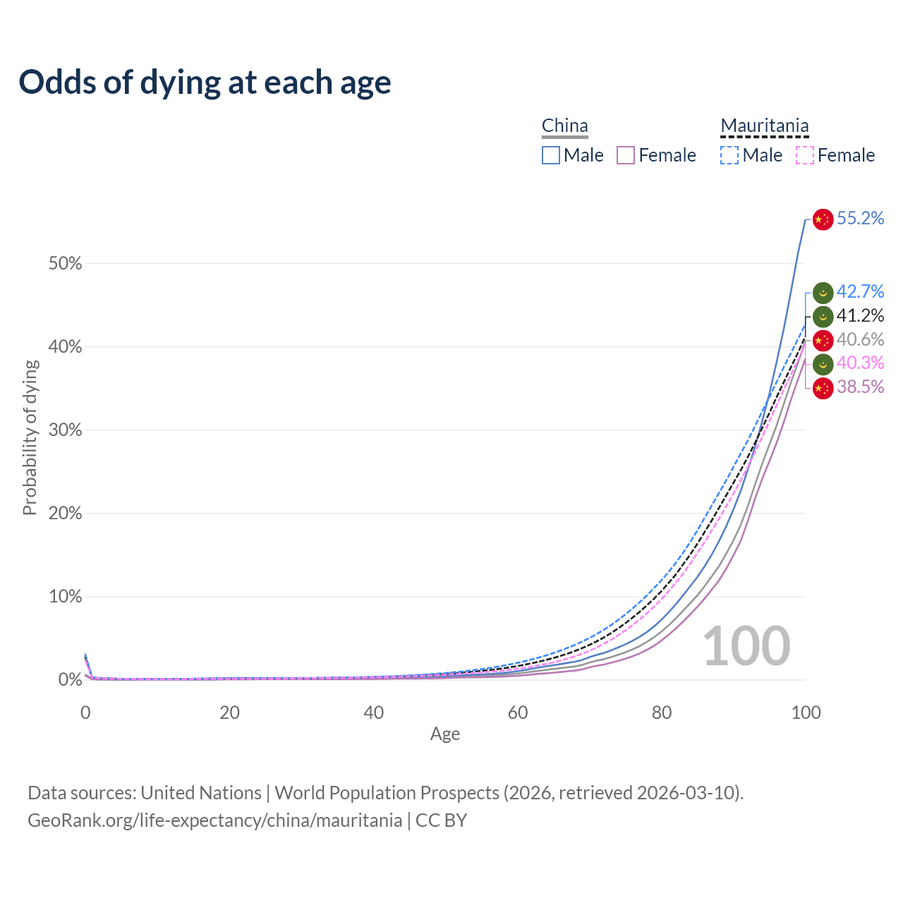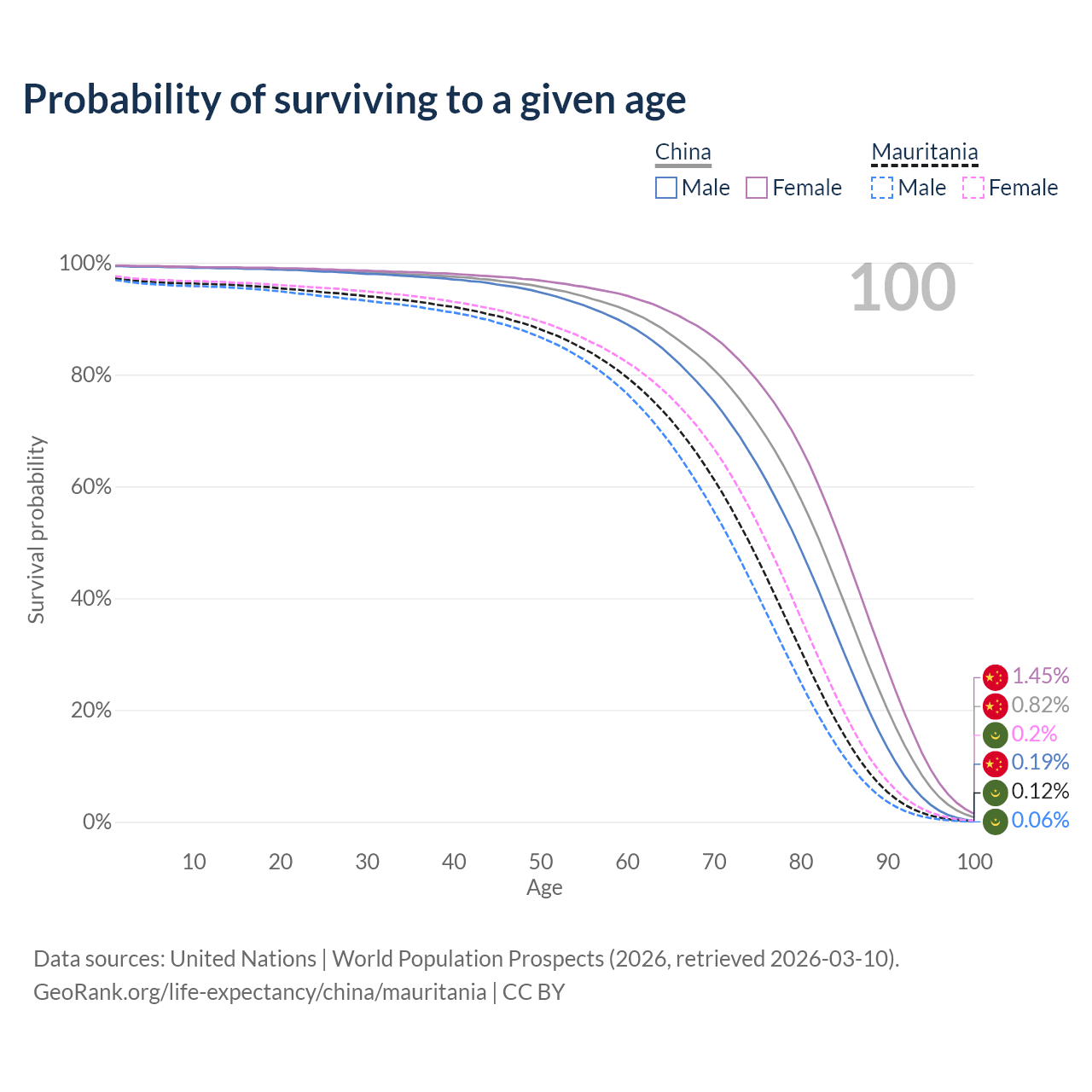 This life expectancy calculator shows the odds of living to 100, 95, 90, and below based on current age for both males and females in China and Mauritania, along with mean and median age of death. The calculations are based on the 2026 life tables (actuarial tables) from the UN World Population Prospects.