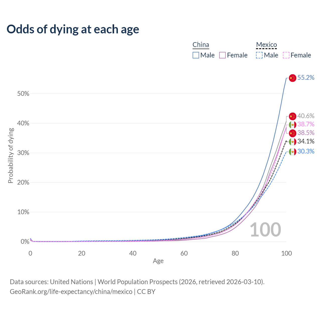 This life expectancy calculator shows the odds of living to 100, 95, 90, and below based on current age for both males and females in China and Mexico, along with mean and median age of death. The calculations are based on the 2026 life tables (actuarial tables) from the UN World Population Prospects.