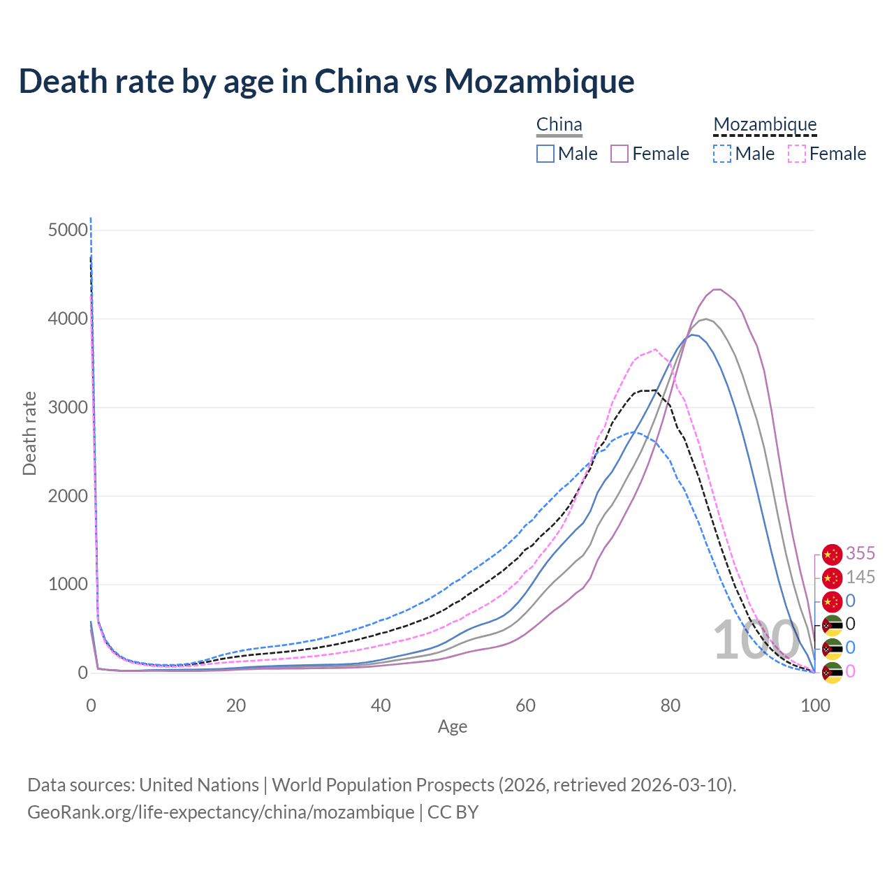 In China, the most common age of death is 85, compared to 0 in Mozambique. The median age of death is 82.3 in China and 71.2 in Mozambique, meaning only half of each cohort is expected to live past that age.