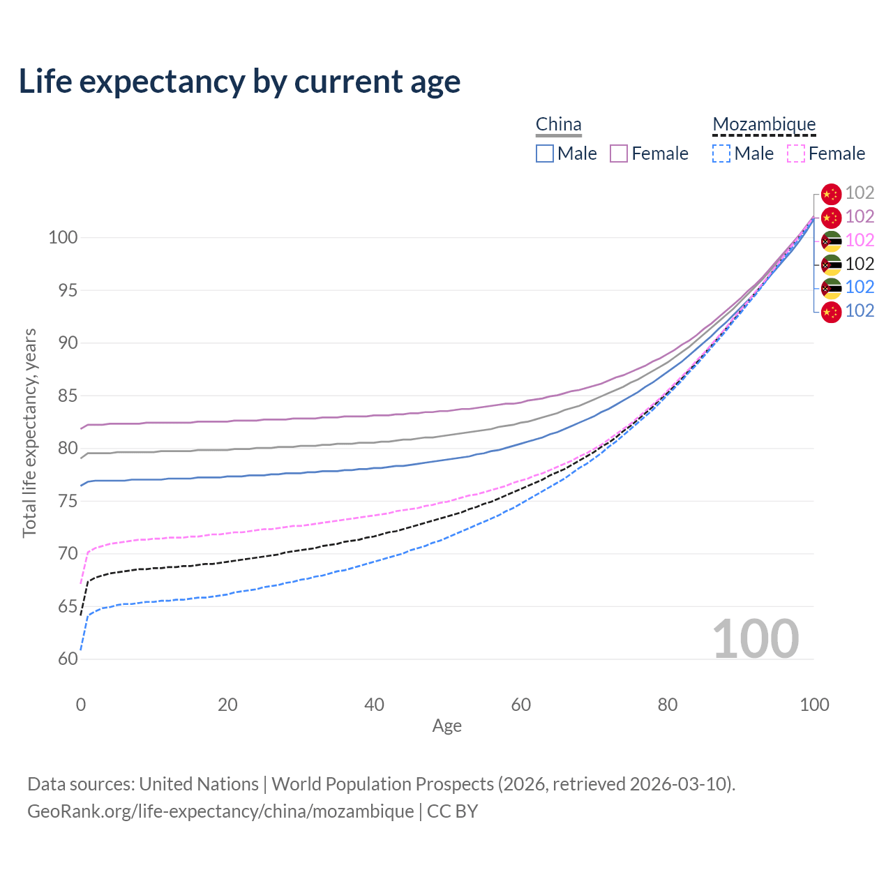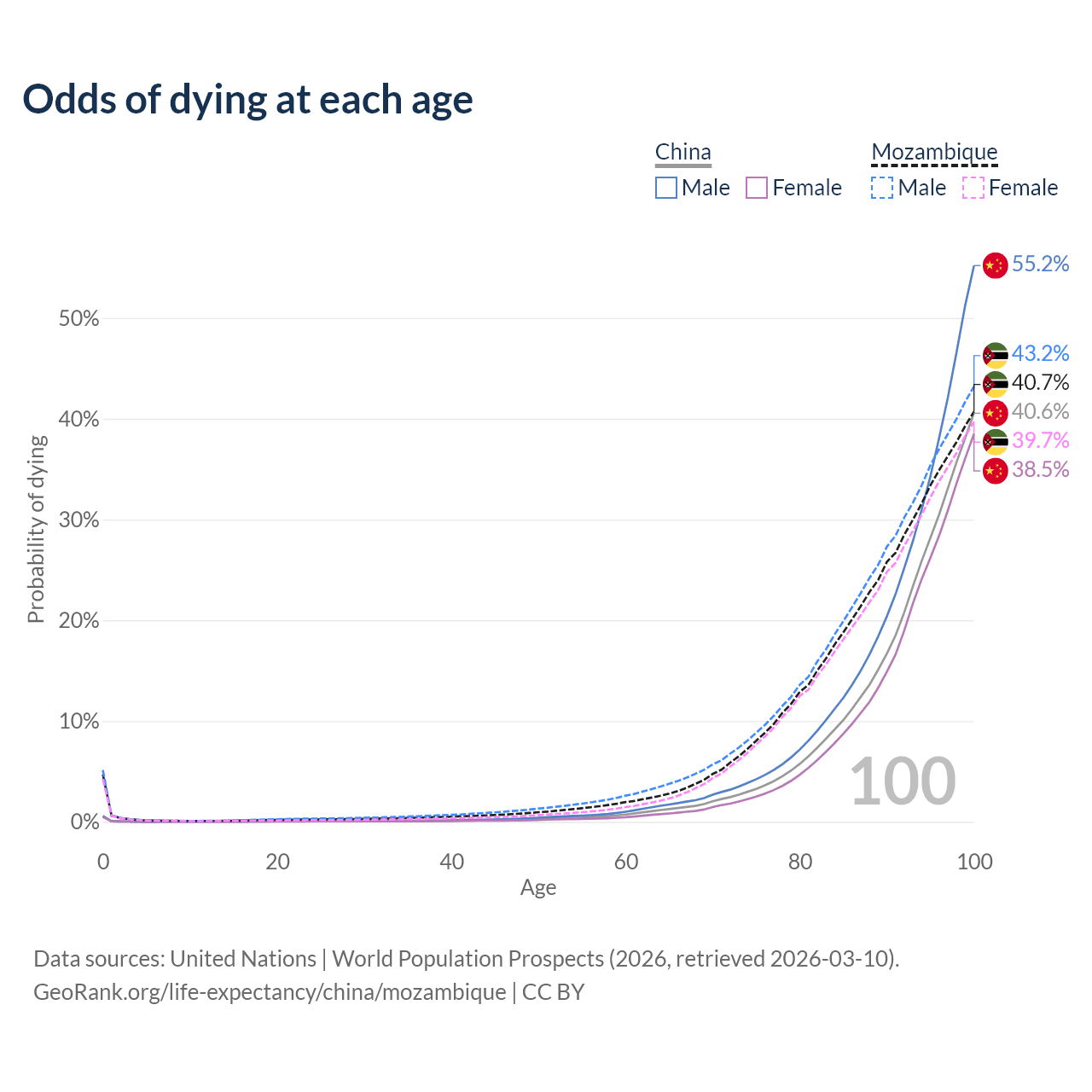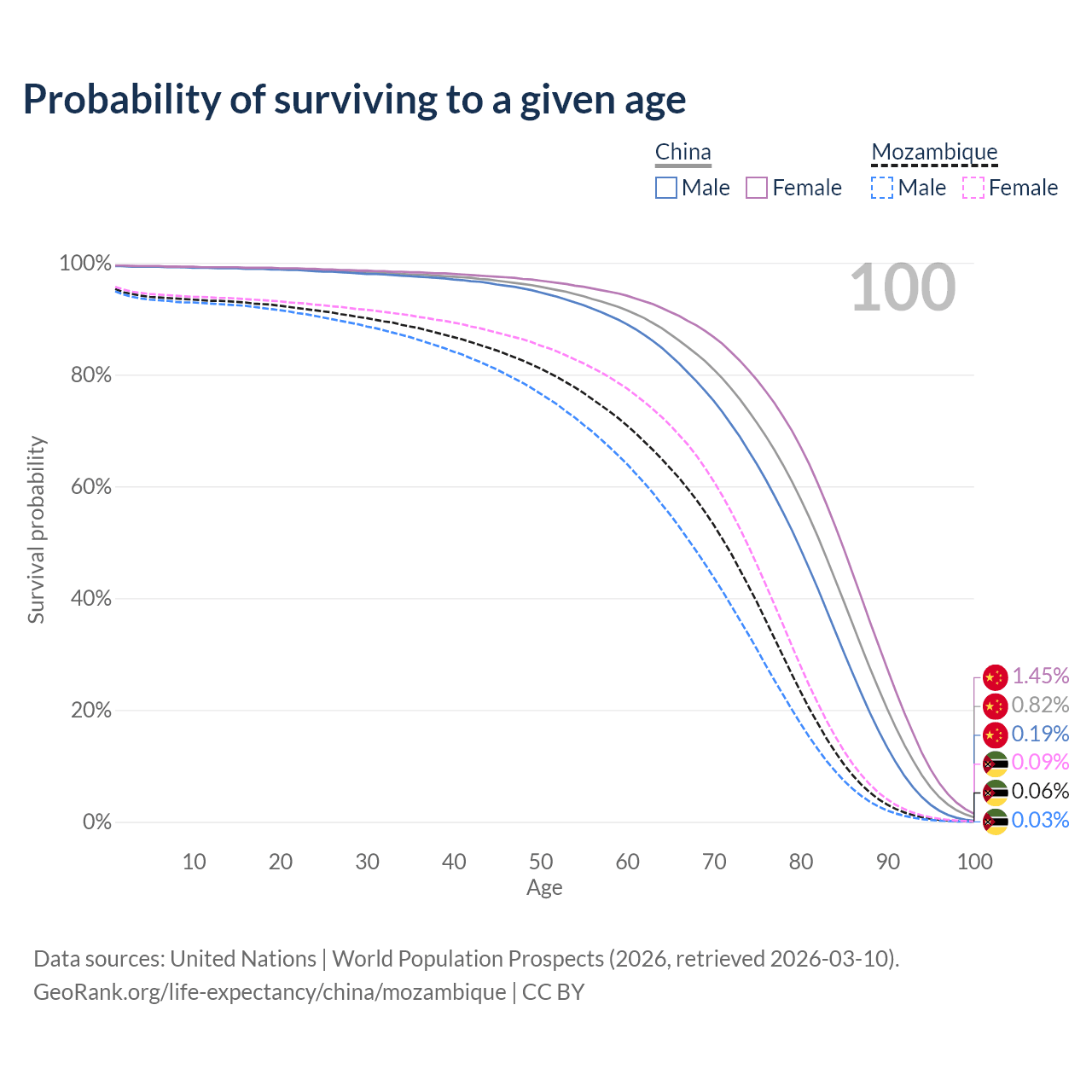 This life expectancy calculator shows the odds of living to 100, 95, 90, and below based on current age for both males and females in China and Mozambique, along with mean and median age of death. The calculations are based on the 2026 life tables (actuarial tables) from the UN World Population Prospects.