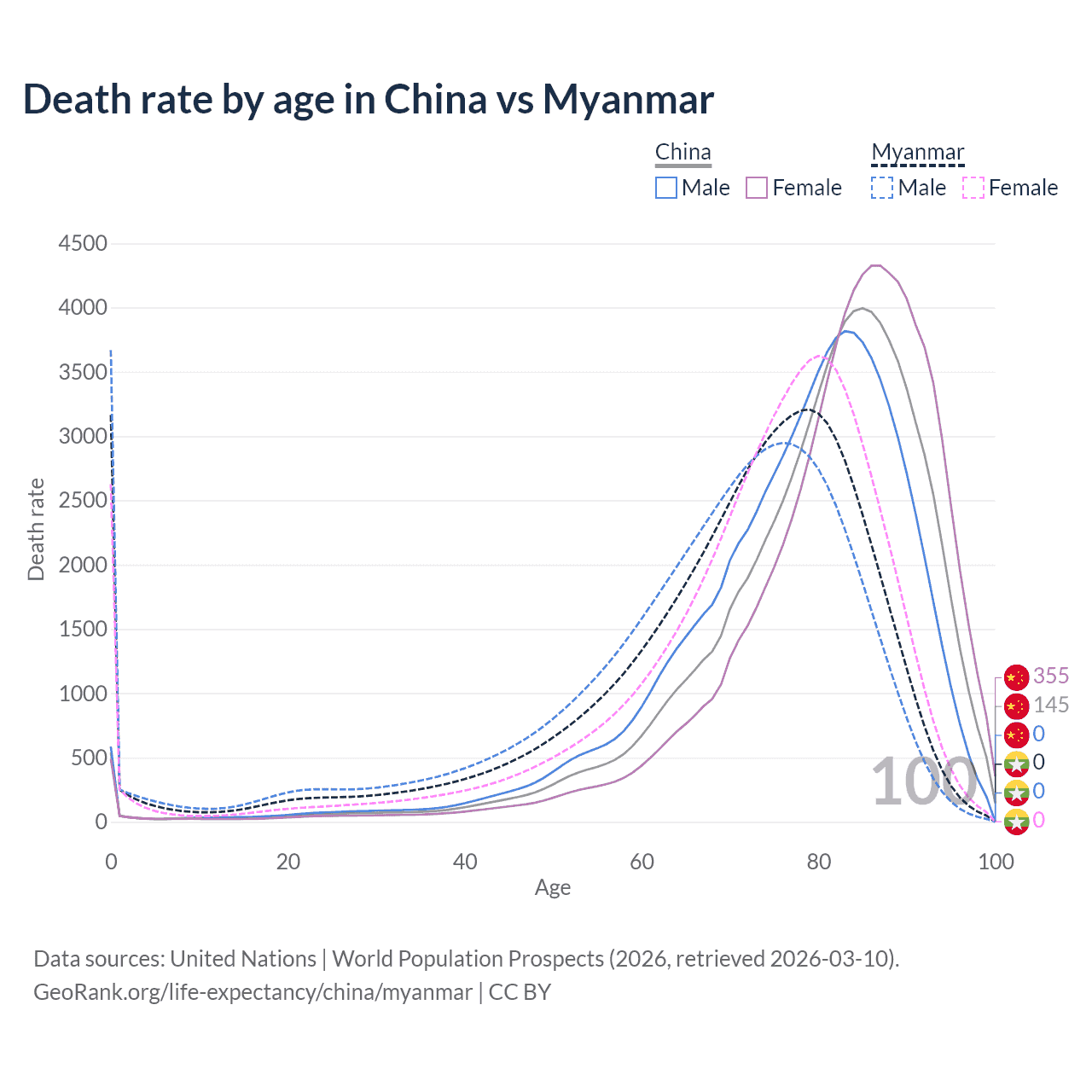 In China, the most common age of death is 85, compared to 79 in Myanmar. The median age of death is 82.3 in China and 73.1 in Myanmar, meaning only half of each cohort is expected to live past that age.