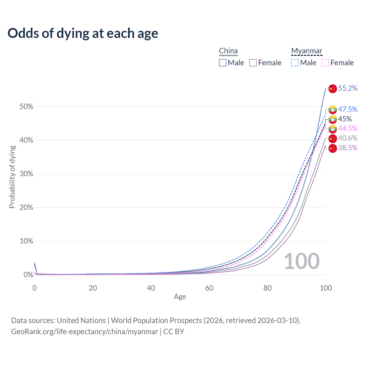 This life expectancy calculator shows the odds of living to 100, 95, 90, and below based on current age for both males and females in China and Myanmar, along with mean and median age of death. The calculations are based on the 2026 life tables (actuarial tables) from the UN World Population Prospects.