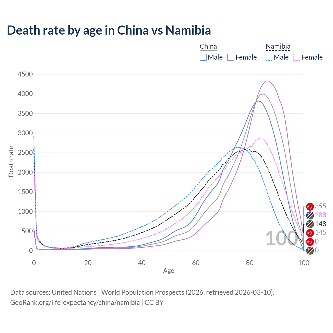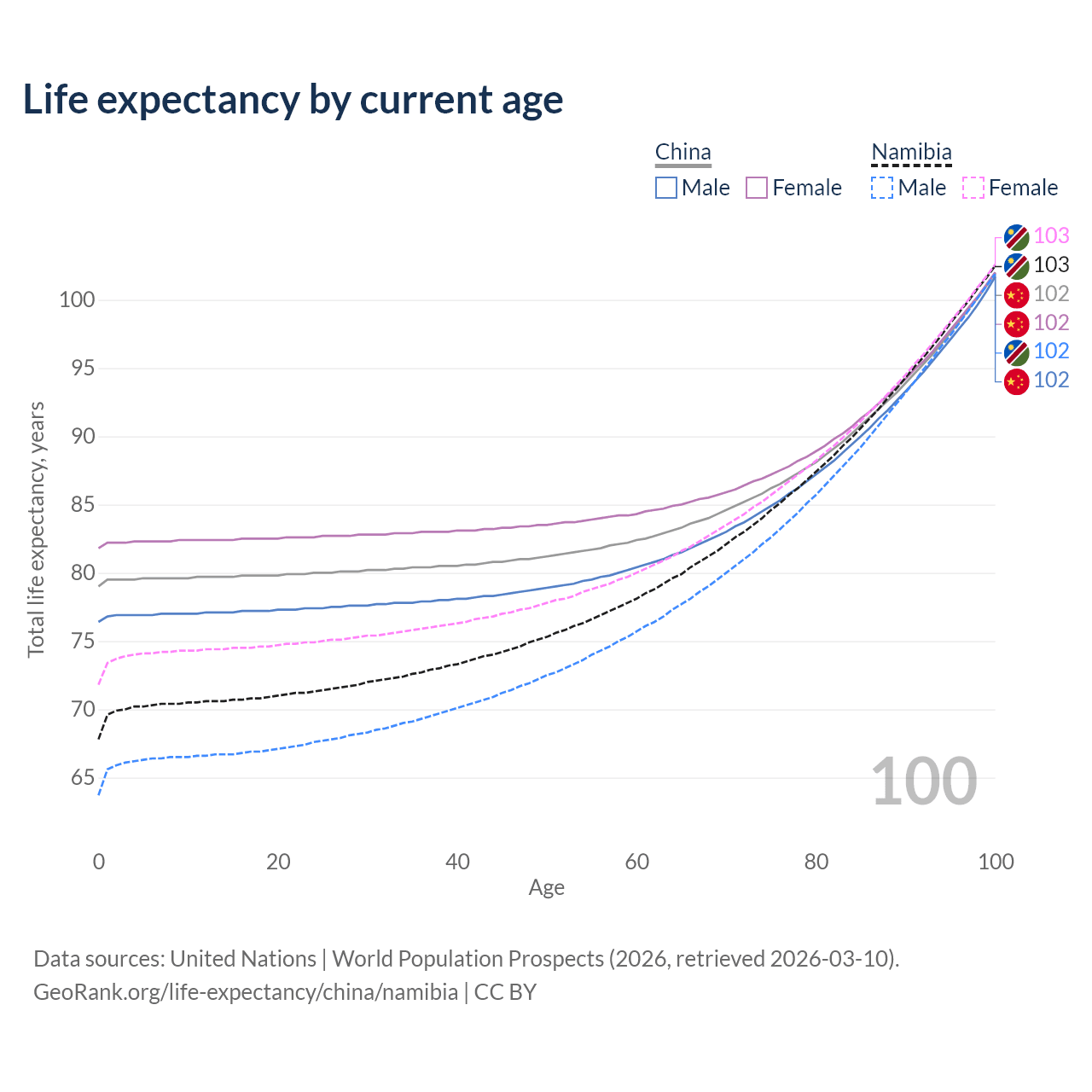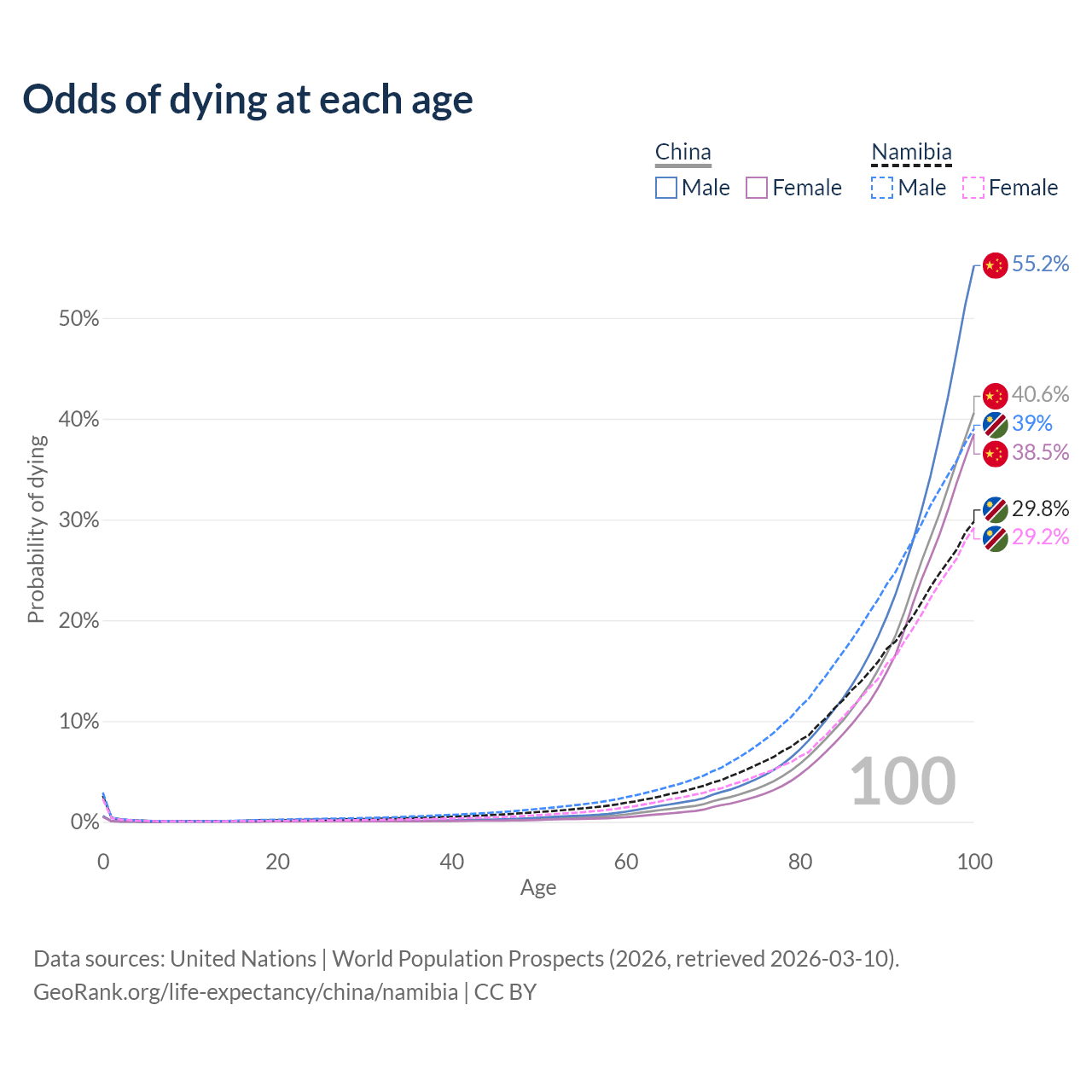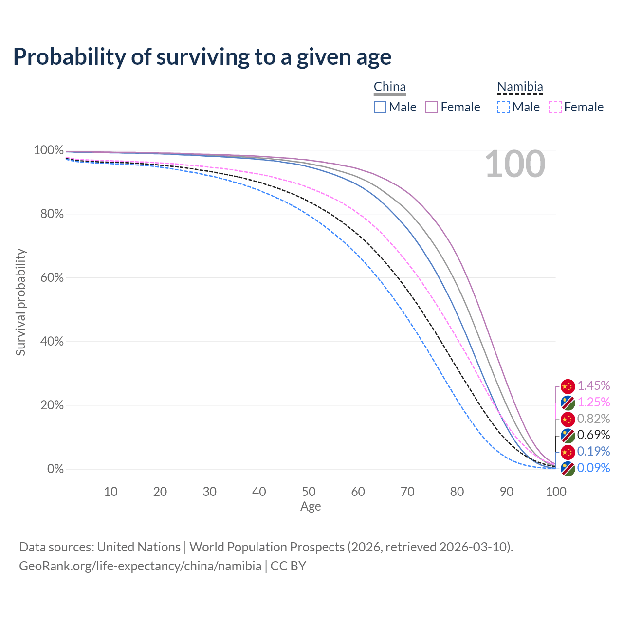 This life expectancy calculator shows the odds of living to 100, 95, 90, and below based on current age for both males and females in China and Namibia, along with mean and median age of death. The calculations are based on the 2026 life tables (actuarial tables) from the UN World Population Prospects.