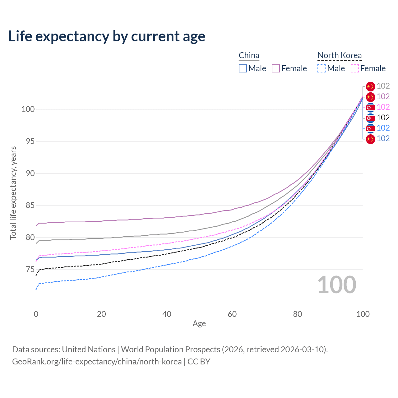 This life expectancy calculator shows the odds of living to 100, 95, 90, and below based on current age for both males and females in China and North Korea, along with mean and median age of death. The calculations are based on the 2026 life tables (actuarial tables) from the UN World Population Prospects.
