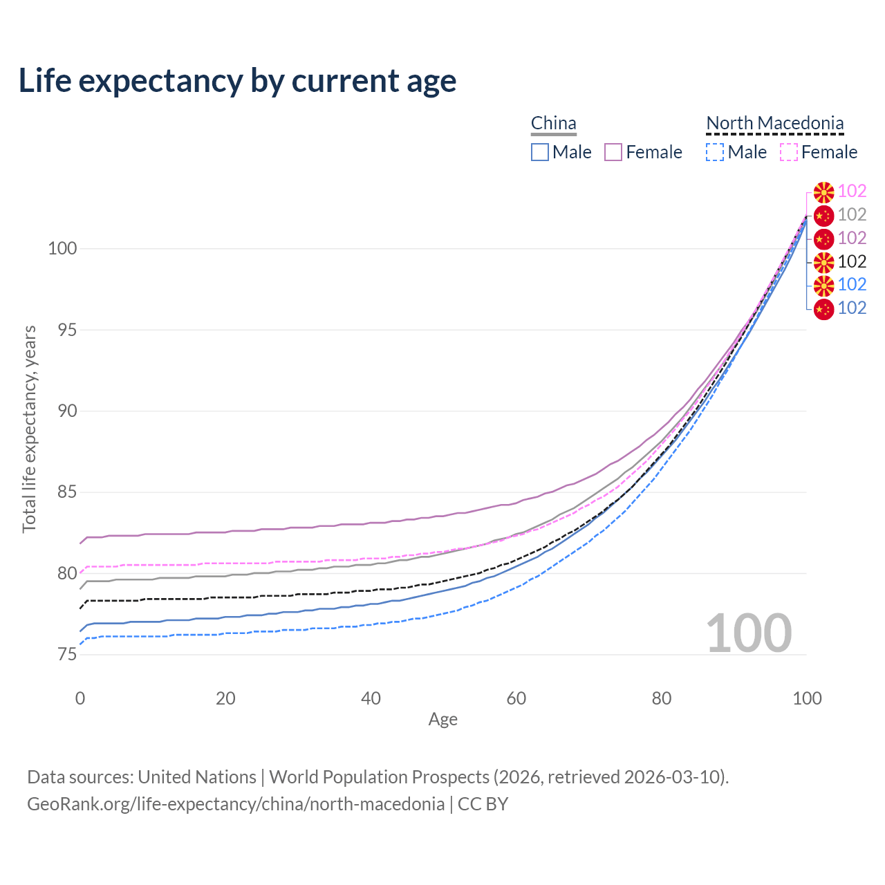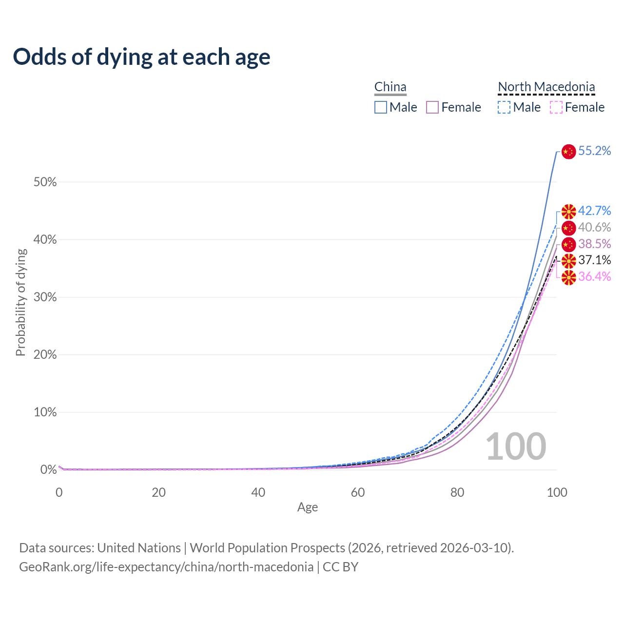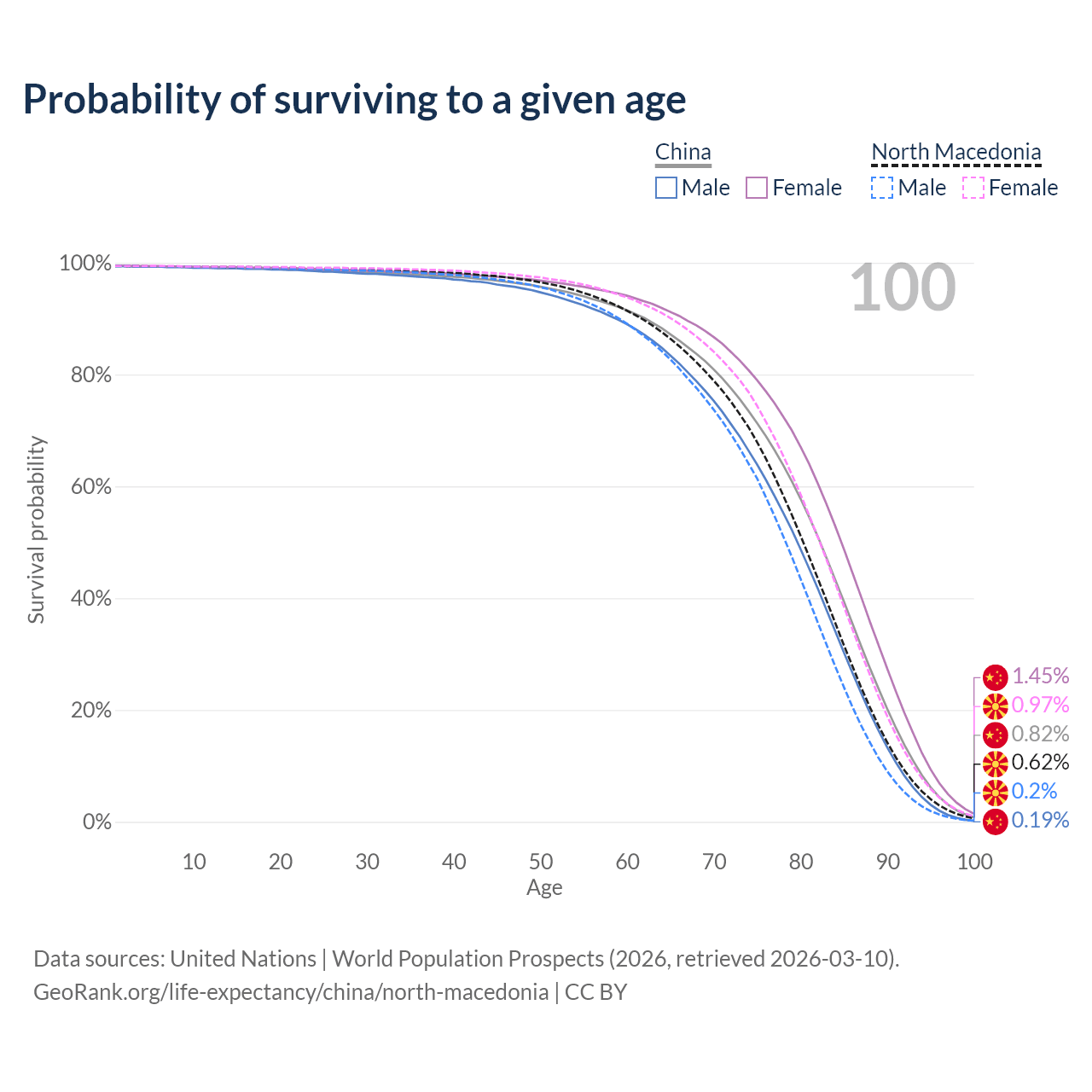 This life expectancy calculator shows the odds of living to 100, 95, 90, and below based on current age for both males and females in China and North Macedonia, along with mean and median age of death. The calculations are based on the 2026 life tables (actuarial tables) from the UN World Population Prospects.