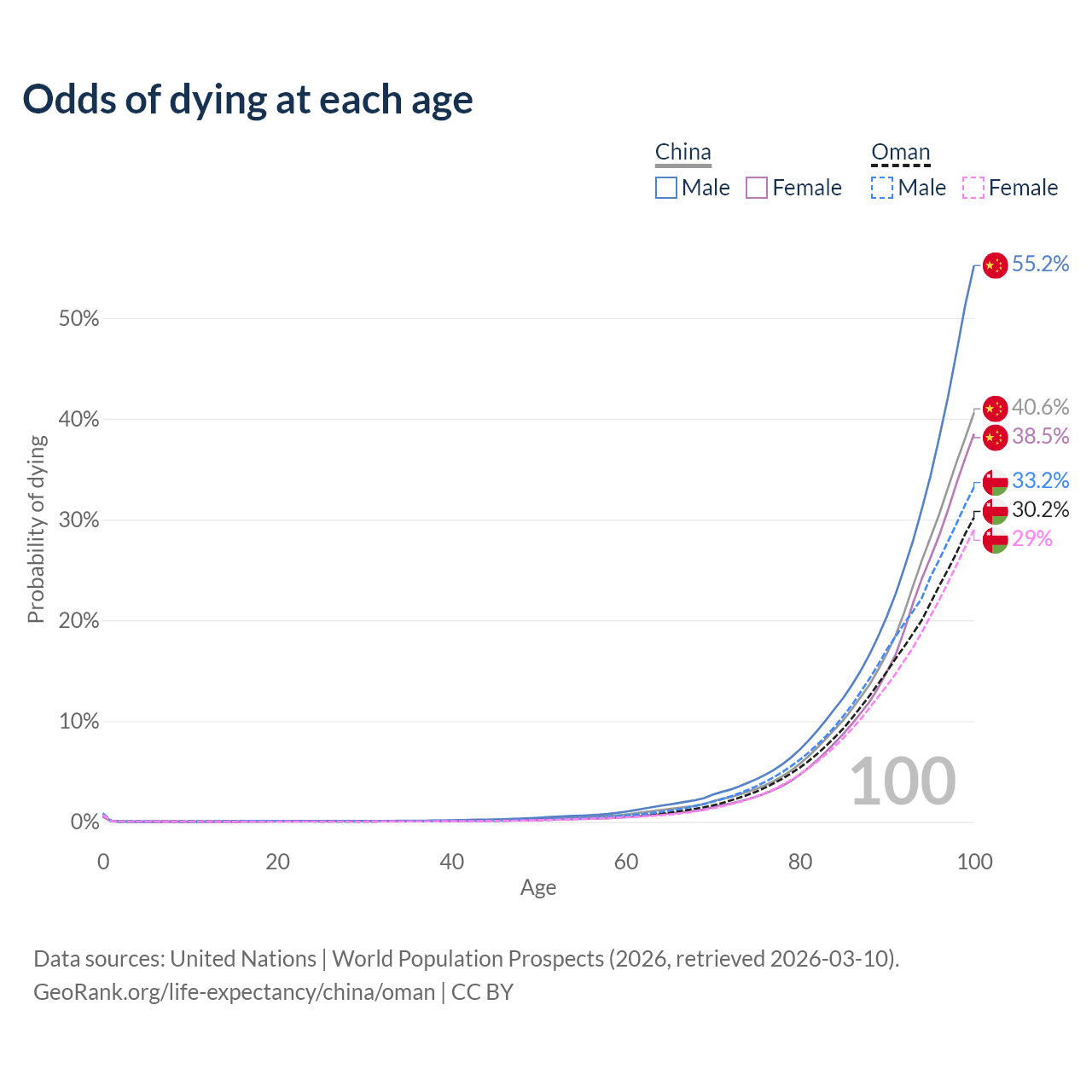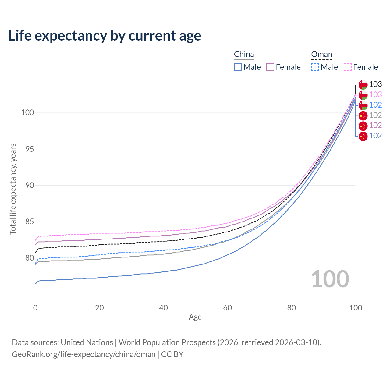 This life expectancy calculator shows the odds of living to 100, 95, 90, and below based on current age for both males and females in China and Oman, along with mean and median age of death. The calculations are based on the 2026 life tables (actuarial tables) from the UN World Population Prospects.