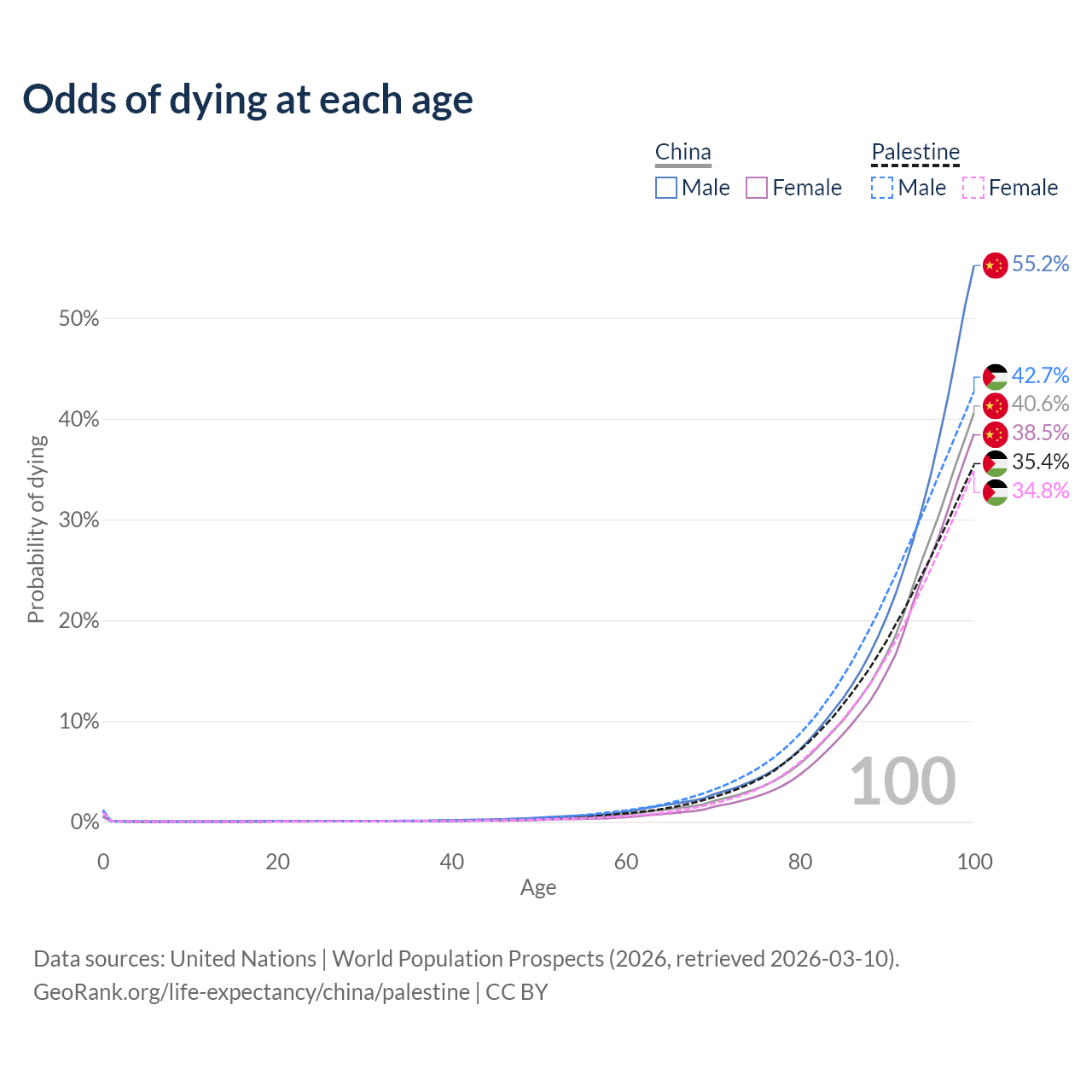 This life expectancy calculator shows the odds of living to 100, 95, 90, and below based on current age for both males and females in China and Palestine, along with mean and median age of death. The calculations are based on the 2026 life tables (actuarial tables) from the UN World Population Prospects.
